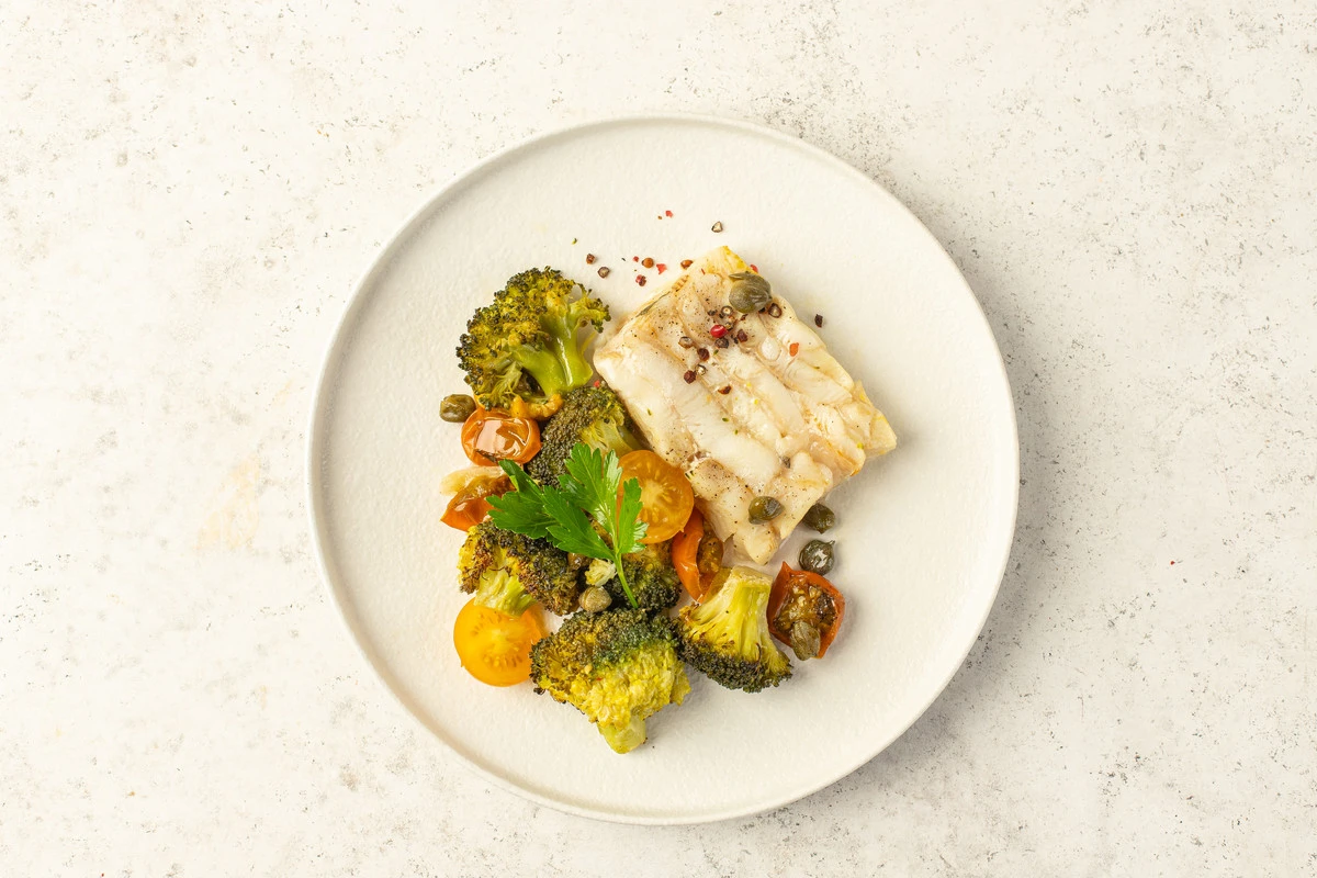 Разложите овощи поверх рыбы, посолите, добавьте каперсы.