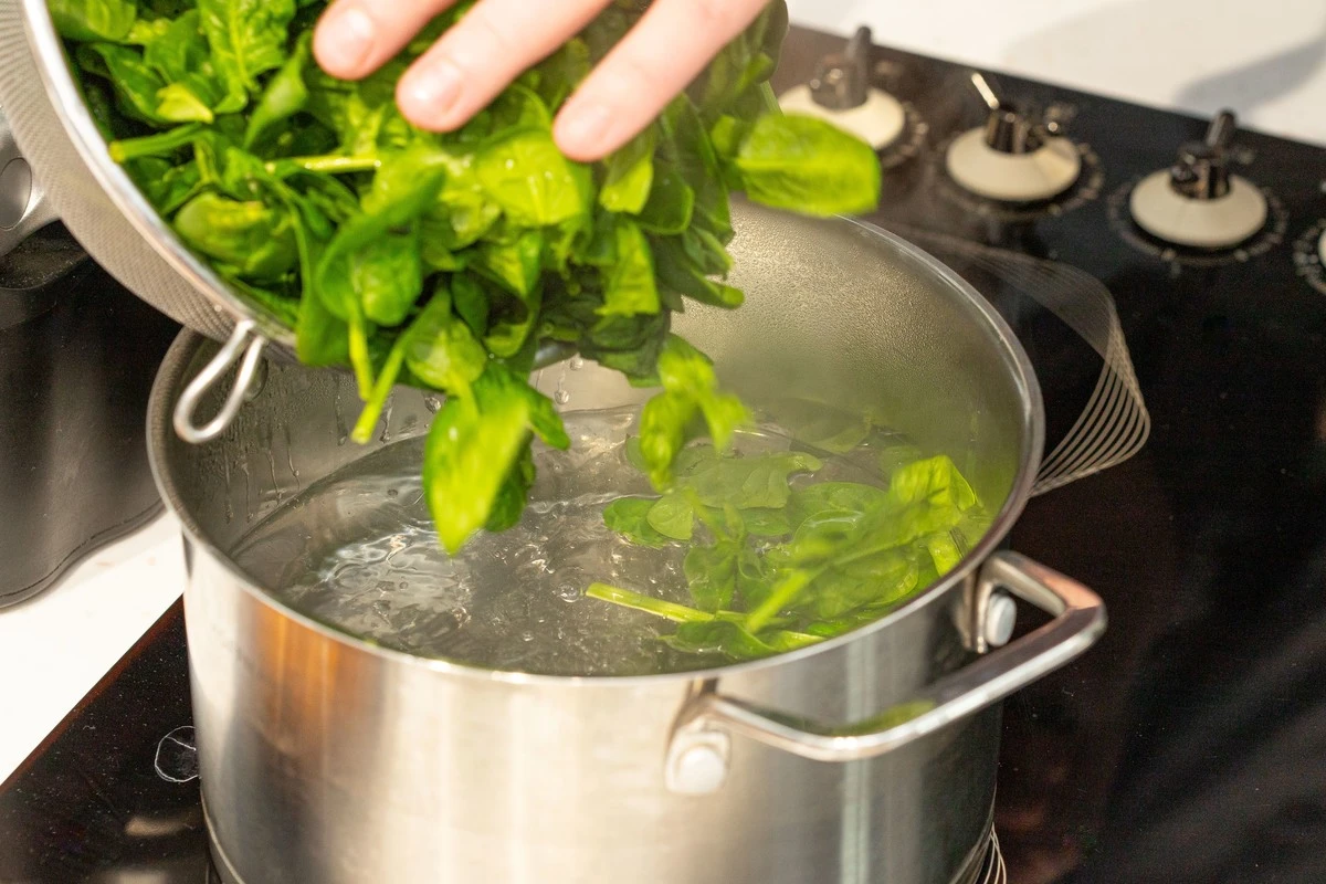 Шпинат промойте. Положите в кипящую воду и варите 2 минуты.
