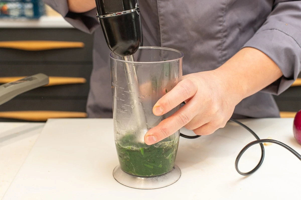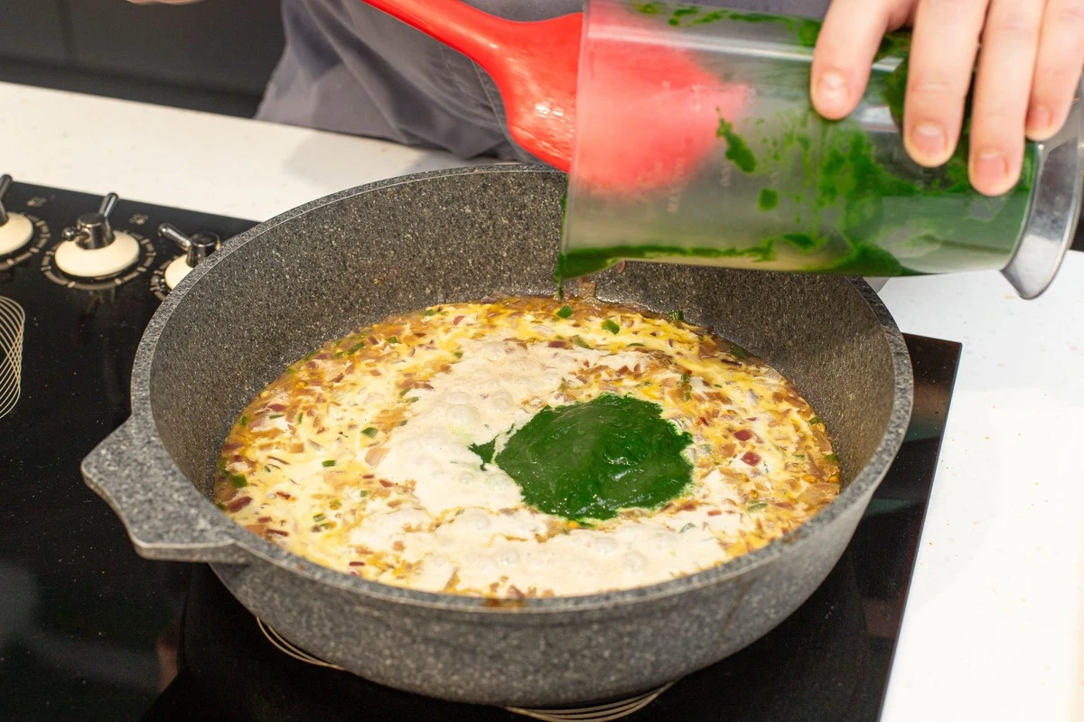 Добавьте воду и тушите примерно 20 минут до выпаривания жидкости. Добавьте сливки, измельчённый шпинат, перемешайте и тушите ещё примерно 5 минут. По желанию соус можете измельчить блендером до однородности.