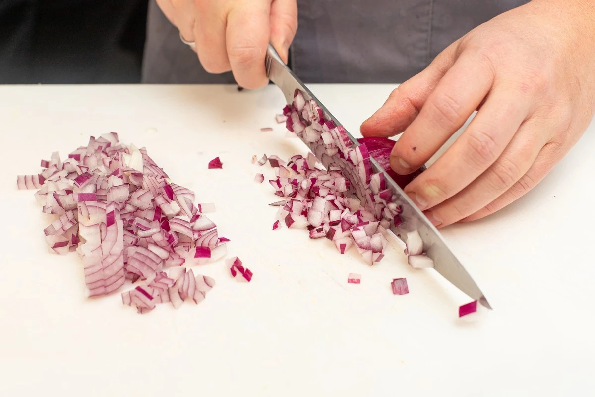 Лук нарежьте кусочками среднего размера, чеснок — соломкой, чили — мелко.