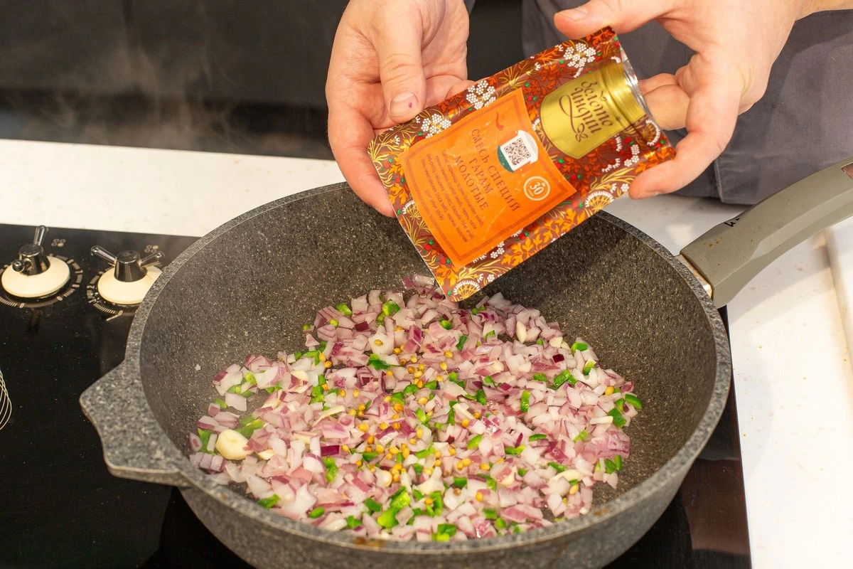 Разогрейте сковороду с растительным маслом и выложите лук, чеснок и чили. Добавьте молотый кориандр, гарам масала, посолите, перемешайте и готовьте примерно 10 минут.