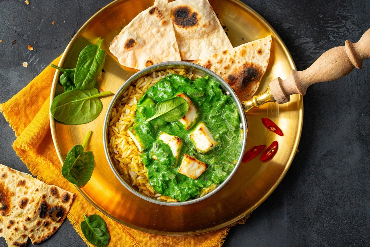 Панир — это традиционный индийский сыр, который готовят из буйволиного или коровьего молока с добавлением лимонного сока. Панир палак — это сыр в густом соусе из шпината. Вы можете использовать для блюда как традиционный индийский сыр, так и взять более привычный нам адыгейский.