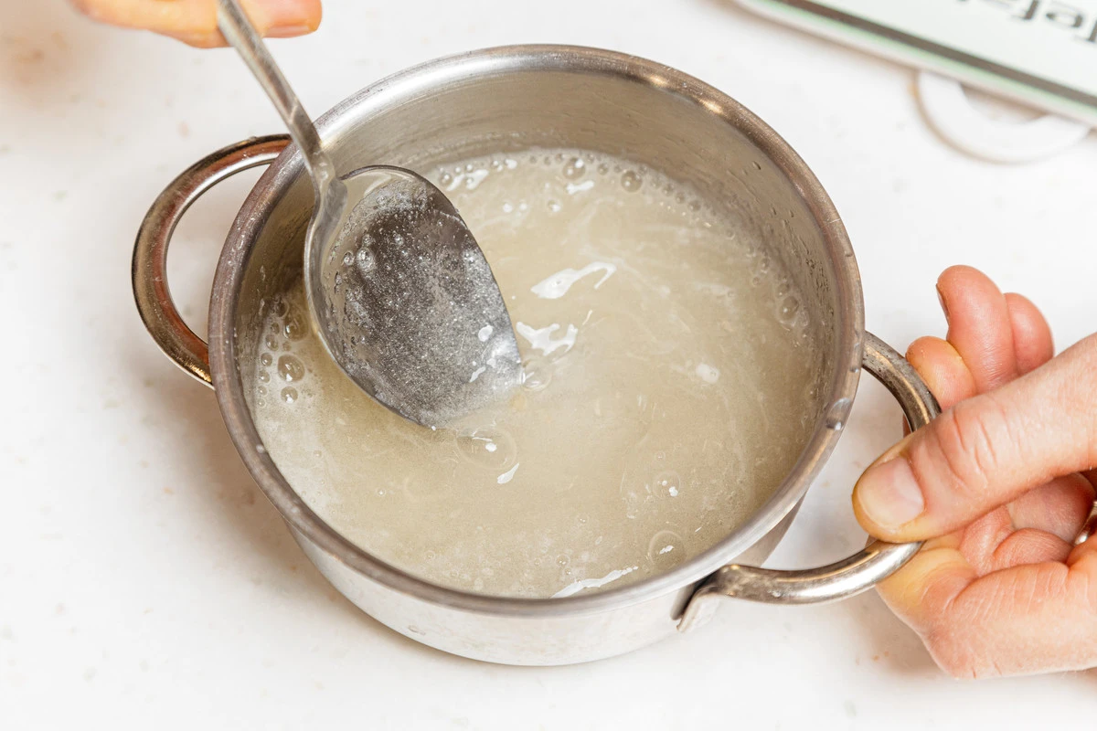В сотейнике нагрейте 100 мл воды примерно до 80 °C, добавьте желатин и размешайте, не доводя до кипения.