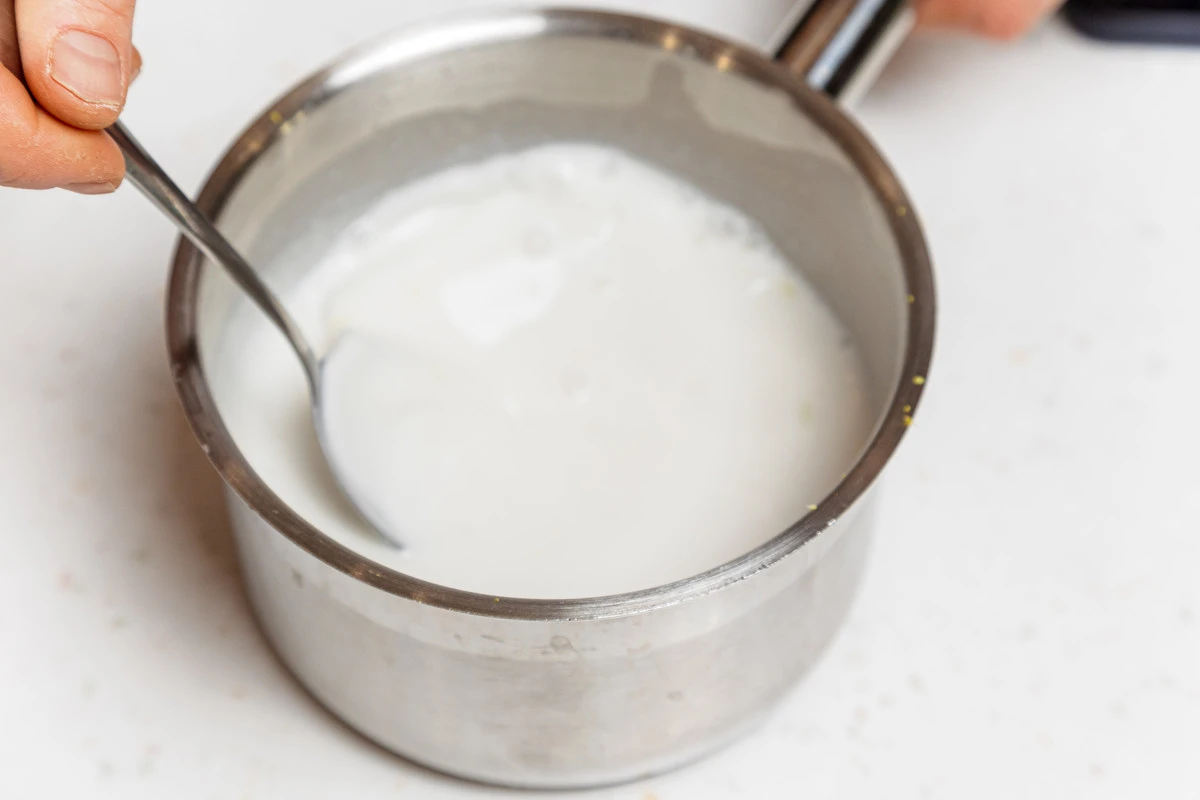 В другой кастрюльке подогрейте кокосовое молоко с сиропом, всыпьте цедру лайма (только зелёную часть). Добавьте желатин в горячее кокосовое молоко и размешайте.