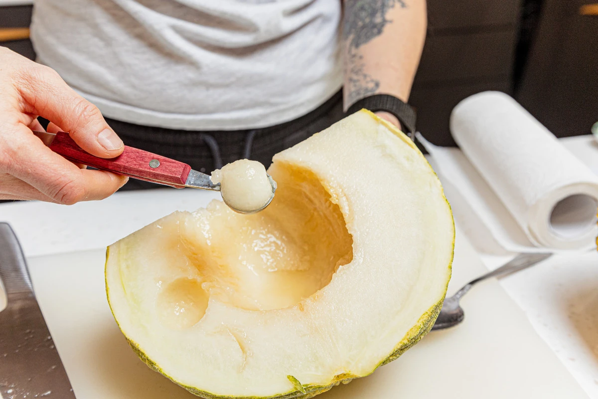 Отрежьте кусок дыни и специальной ложечкой выньте мякоть в форме шариков. Если такой ложки нет, мякоть дыни можно нарезать кубиками.