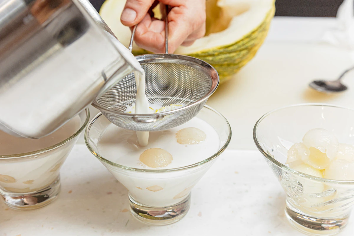 Выложите немного дынных шариков в каждый стаканчик, залейте кокосовой смесью через сито. Уберите в холодильник на 1-2 часа до застывания.