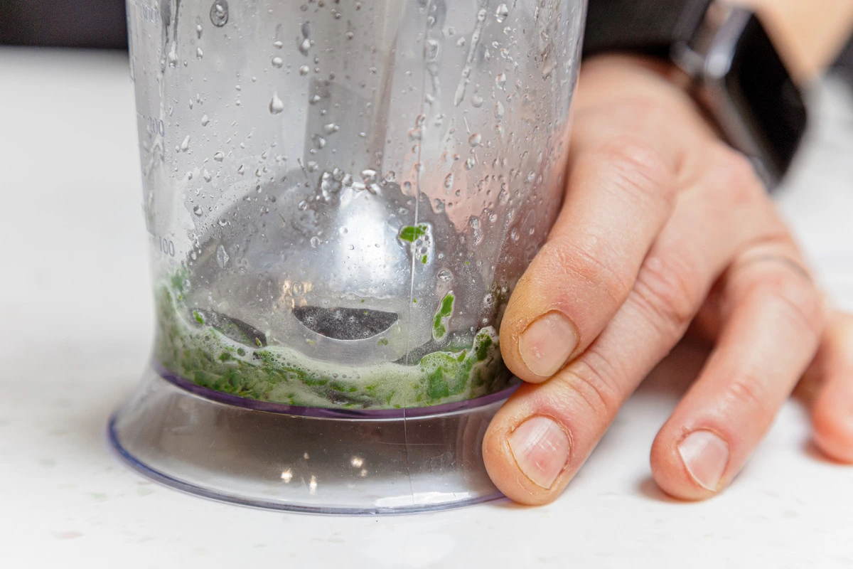 Приготовьте мятный топинг. Листики мяты пробейте в блендере с 1 столовой ложкой горячей воды и соком, выжатым из лайма.