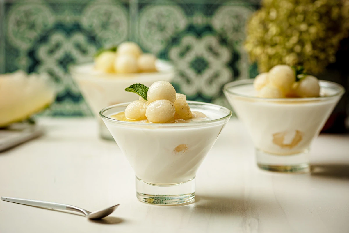 Очень нежный десерт с необычным тонким сочетанием вкусов. Для него важно выбрать по-настоящему ароматную дыню и обязательно сделать мятный топинг.