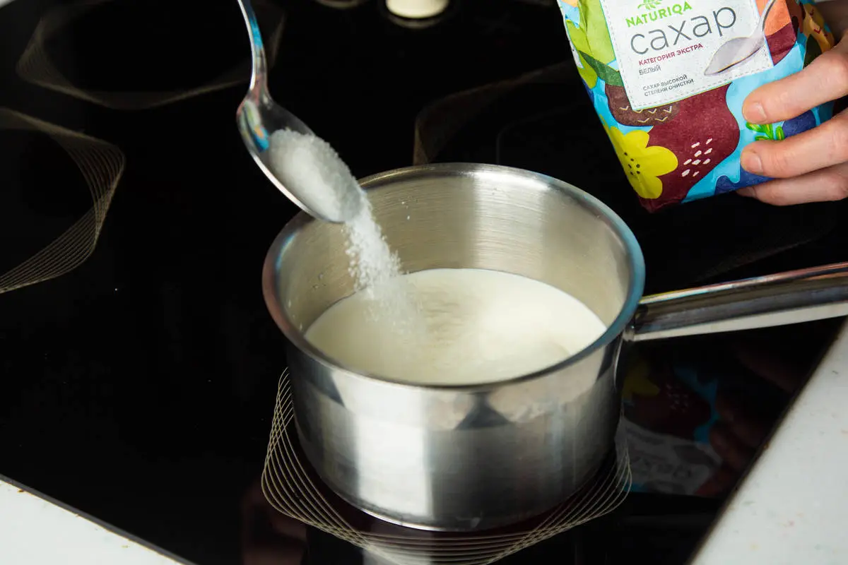 Сливки вылейте в сотейник, отмерьте такое же количество молока (можно использовать в качестве мерной ёмкости бутылочку от сливок), смешайте молочно-сливочную смесь с сахаром.