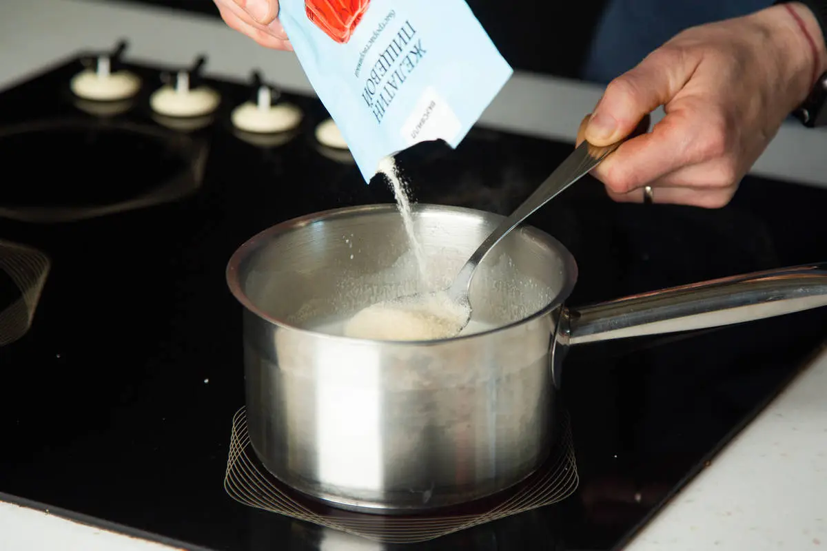 Подогрейте смесь, не доводя до кипения, всыпьте желатин.