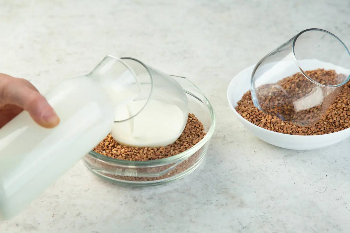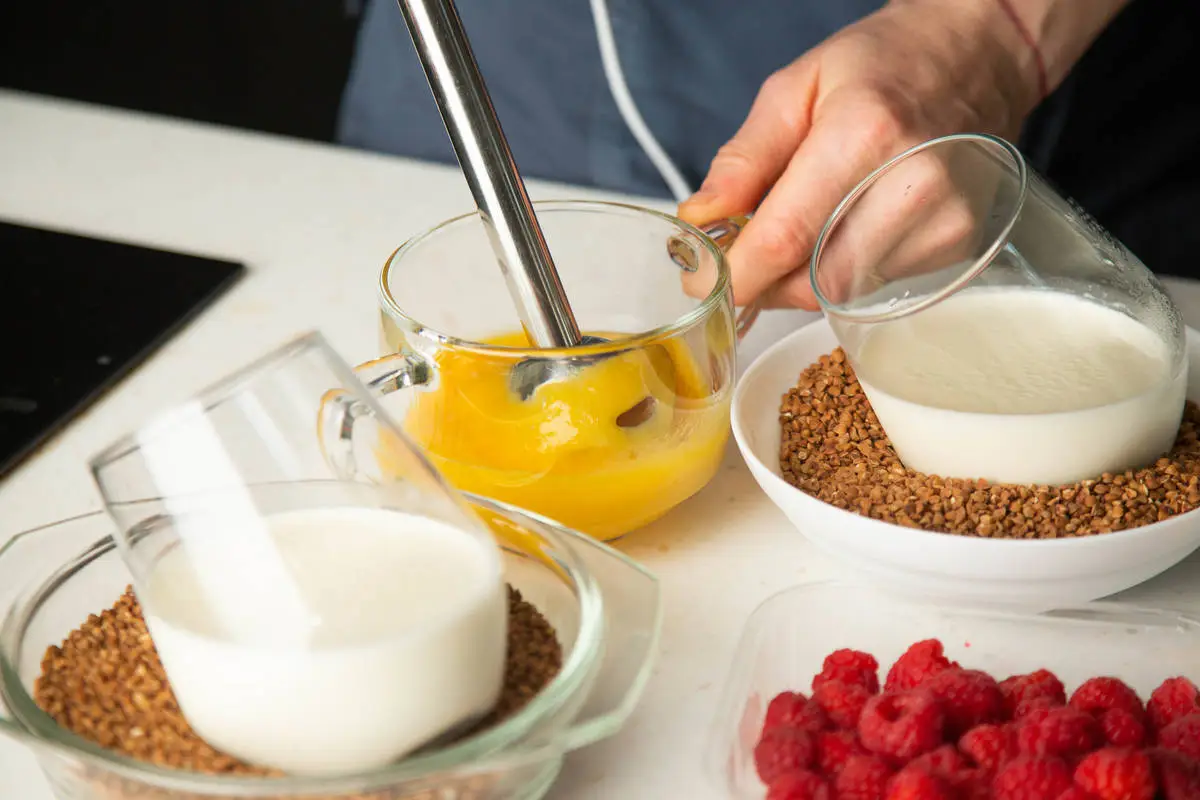 Подготовьте красивые ёмкости — стаканчики, бокалы или креманки. Разлейте будущую панна-котту по ёмкостям и уберите в холодильник до застывания (на 2-3 часа). Если хочется сделать необычную подачу, можно зафиксировать ёмкости в наклонном положении, например, насыпав любую крупу в миску и установив стаканчики под углом 45 градусов, а затем залить смесь.