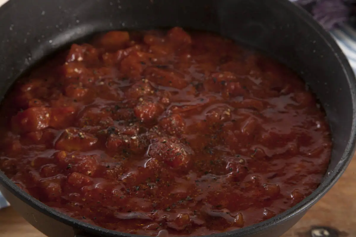 Консервированные томаты выложите в сковороду, добавьте оливковое масло и порубленный чеснок, соль и перец, готовьте при легком кипении около 15-ти минут, затем всыпьте порубленные листья базилика.
