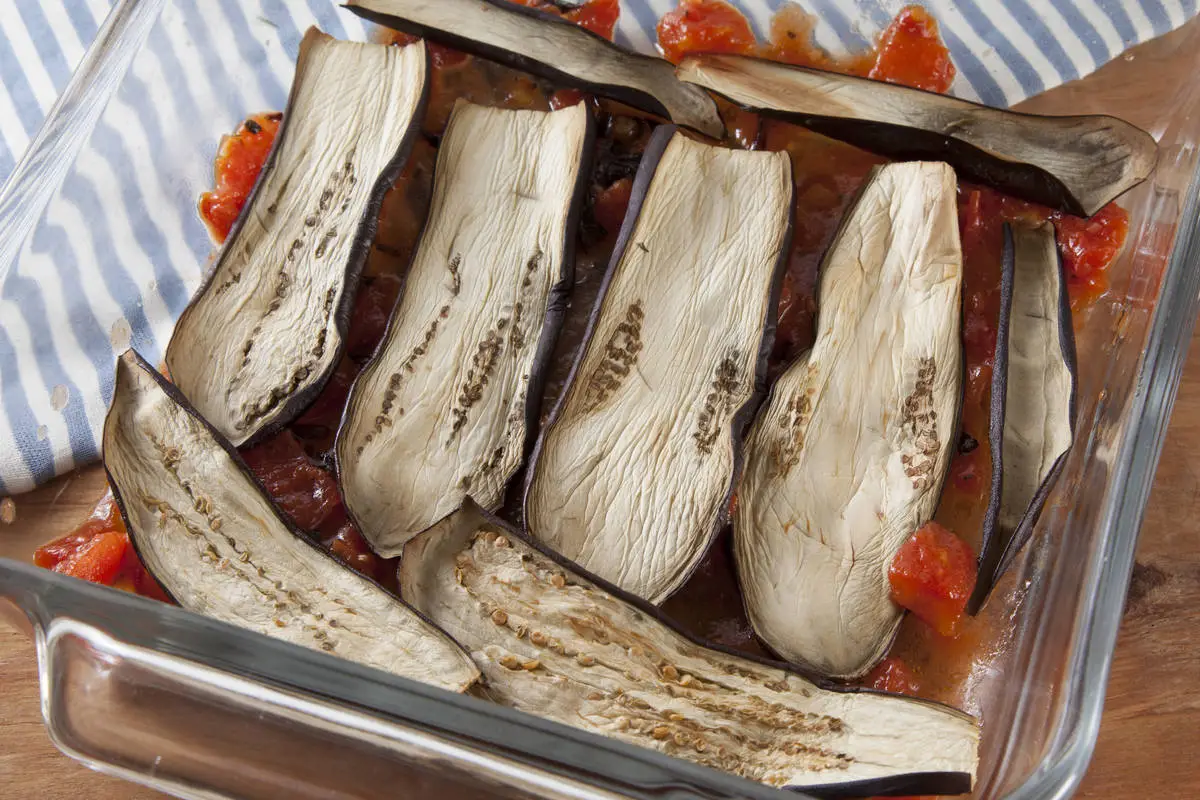 С ломтиков баклажана слейте выделившийся сок, слегка отожмите, выложите на противень или решетку и запекайте 20 минут.
