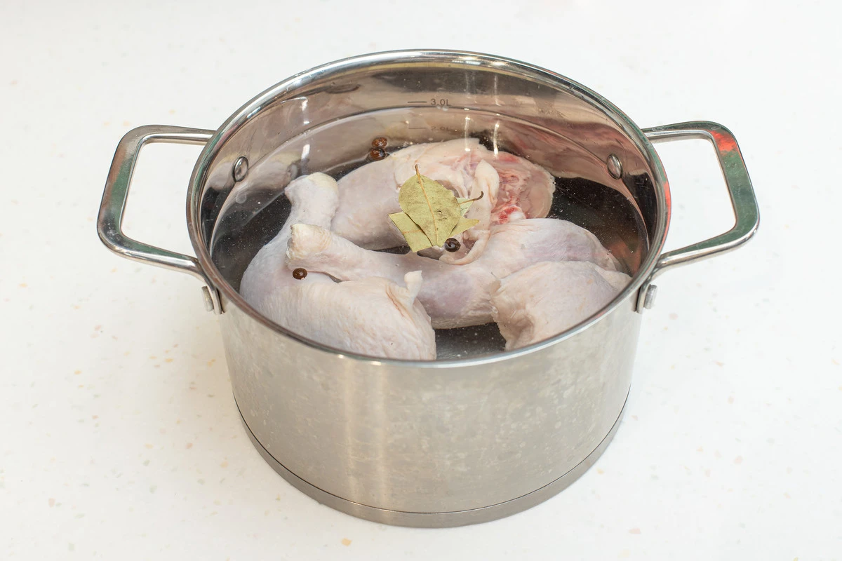 Помойте окорочка, обсушите бумажным полотенцем, положите в кастрюлю. Добавьте лавровый лист, перец горошком. Залейте водой так, чтобы она покрывала окорочка на три пальца, и варите на среднем огне примерно час, пока курица не размягчится и не станет легко отделяться от костей.