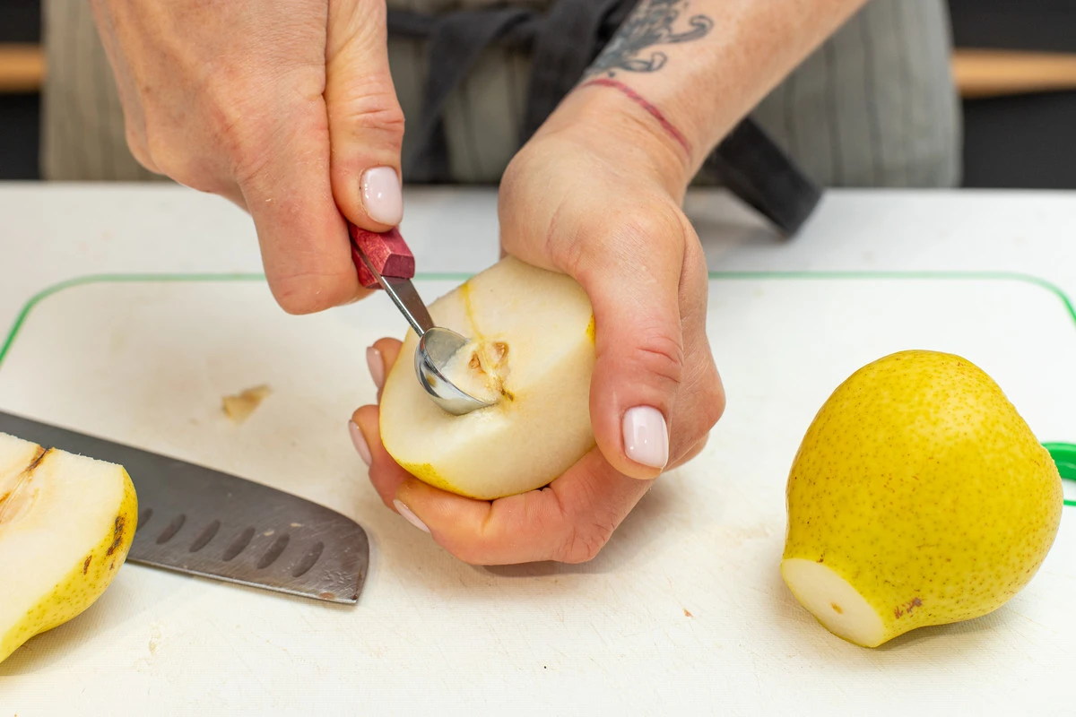 Груши помойте, отрежьте плодоножки (чистить не надо!). Ложкой вырежьте сердцевину. Важно, чтобы груши были крепкие, не перезрелые, иначе они дадут слишком много жидкости при карамелизации.