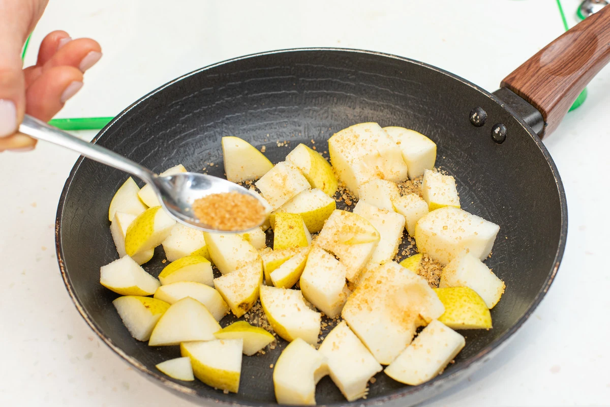 Нарежьте груши кубиками 2 х 2 см, положите на сковороду, добавьте сахар и карамелизируйте на среднем огне без масла, на это уйдёт примерно 10 минут.