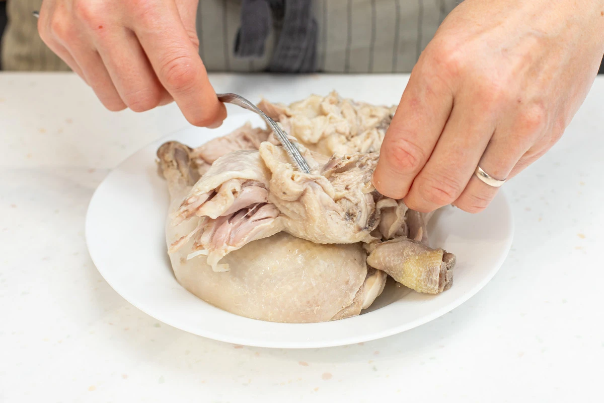 По желанию при варке курицы добавьте целую очищенную морковь, целую очищенную луковицу, а воды налейте примерно 2 л — тогда у вас, помимо паштета, получится отличный бульон. Посолите его по вкусу.