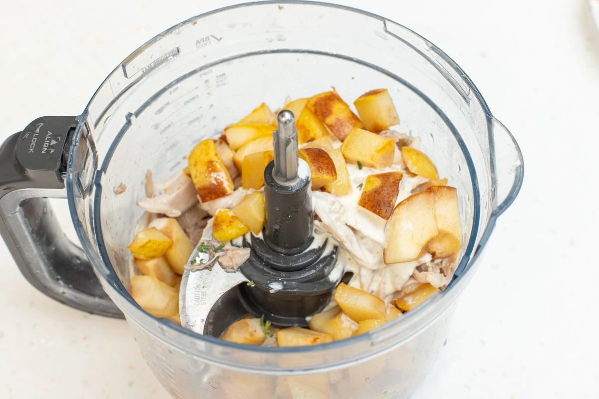 Добавьте растопленные сливки, листья тимьяна, карамелизированные груши и измельчите до однородности. Посолите по вкусу, перемешайте. Не используйте для измельчения горячих ингредиентов вакуумный блендер! Лучше взять обычный блендер или комбайн — это безопаснее.