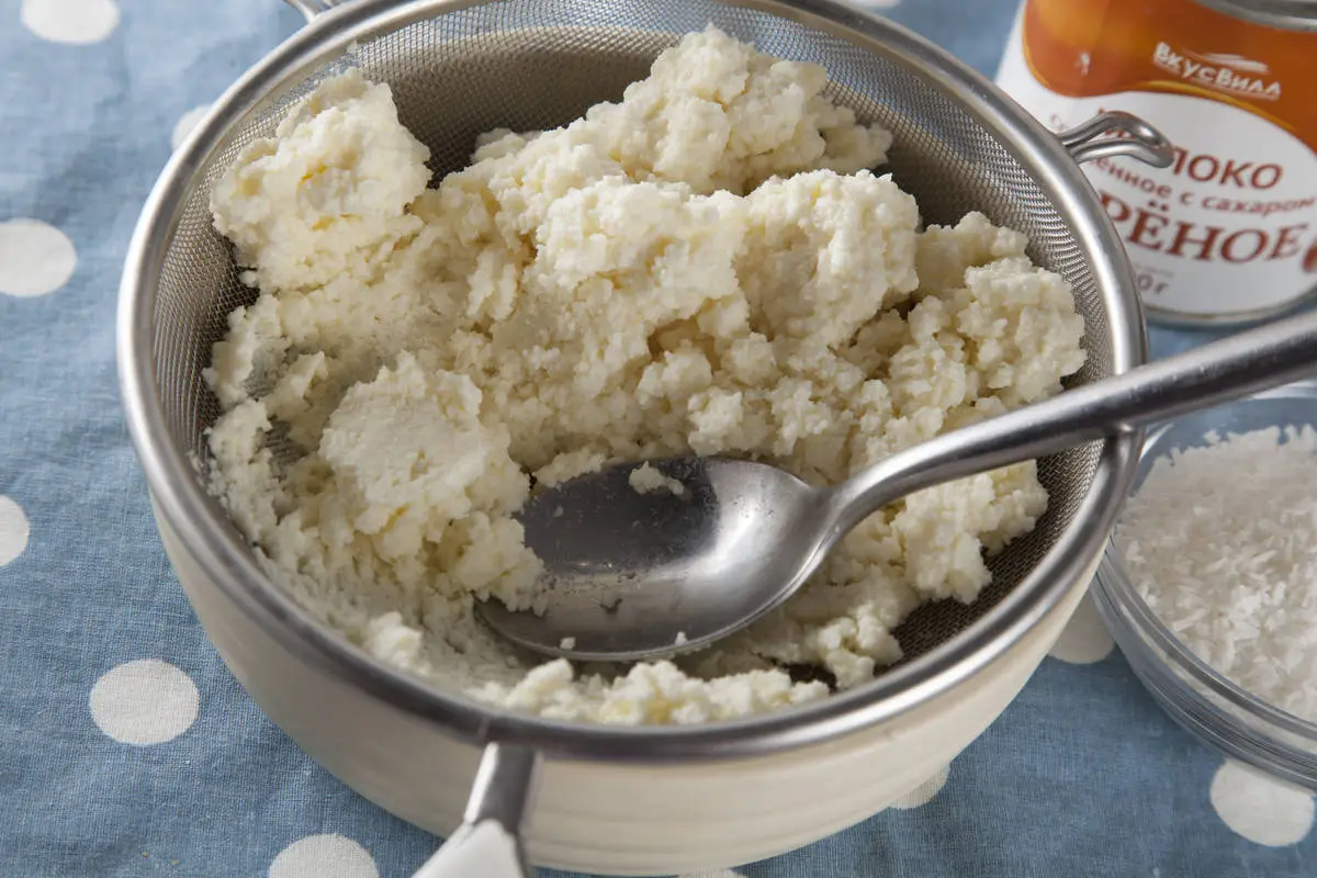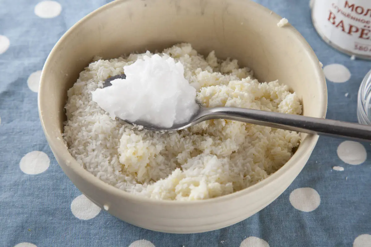 Дальше все просто! В одну миску с протертой рикоттой добавьте кокосовую стружку и размягченное кокосовое масло, хорошо размешайте ложкой.
