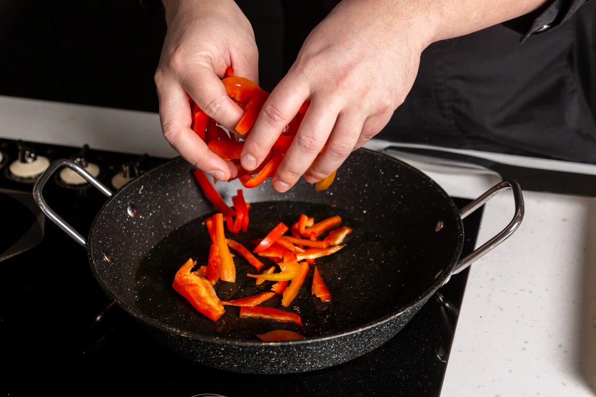 Чили и болгарский перец мелко порубите и обжарьте на оливковом масле.