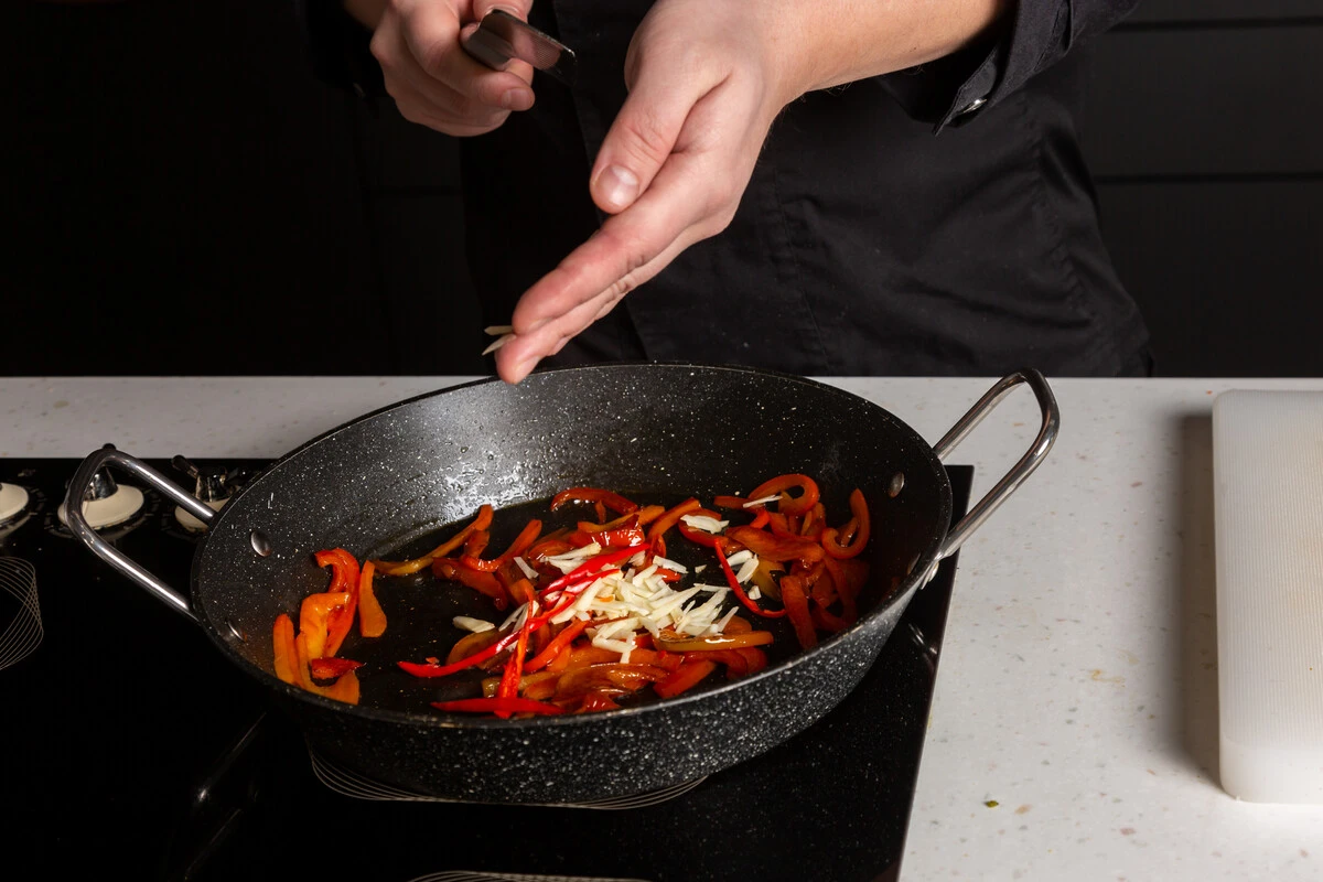Измельчённый чеснок добавьте к перцам и готовьте ещё буквально минуту. Посолите и поперчите.