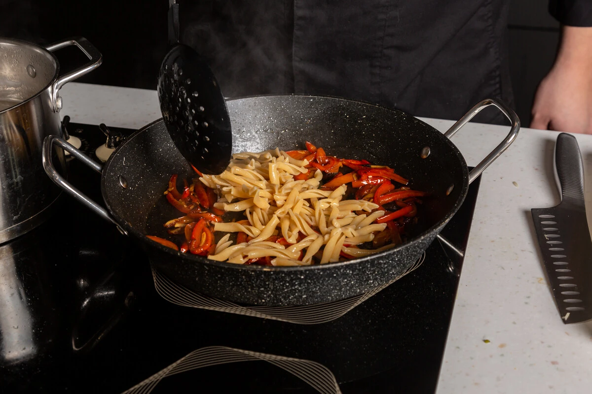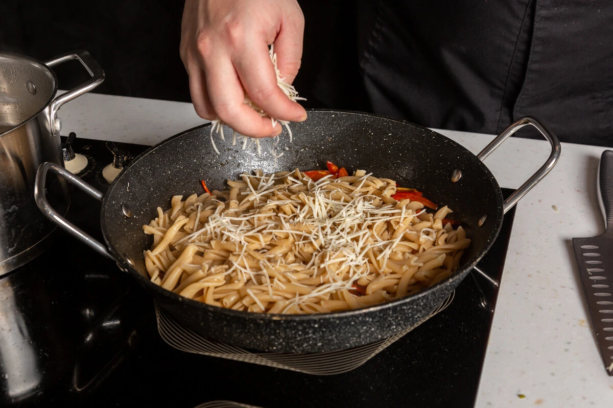 Выложите в сковороду отварную пасту и смешайте с овощами, добавьте ещё немного оливкового масла и снимите с огня.