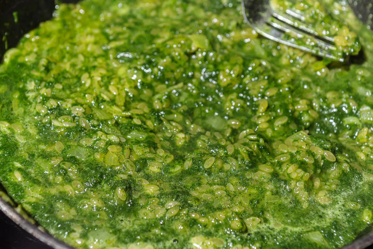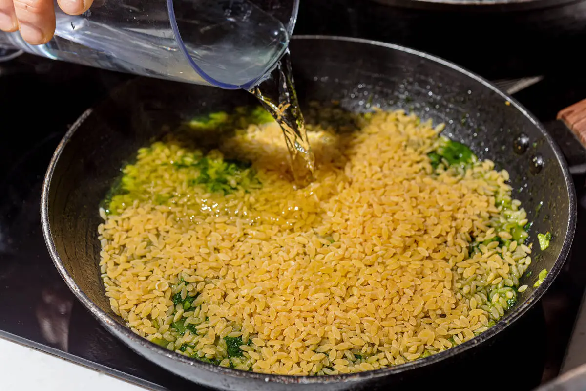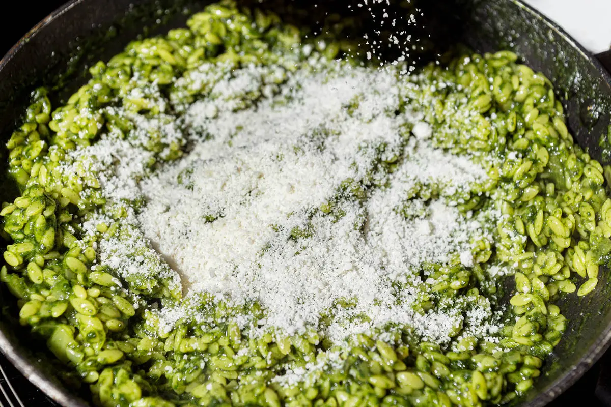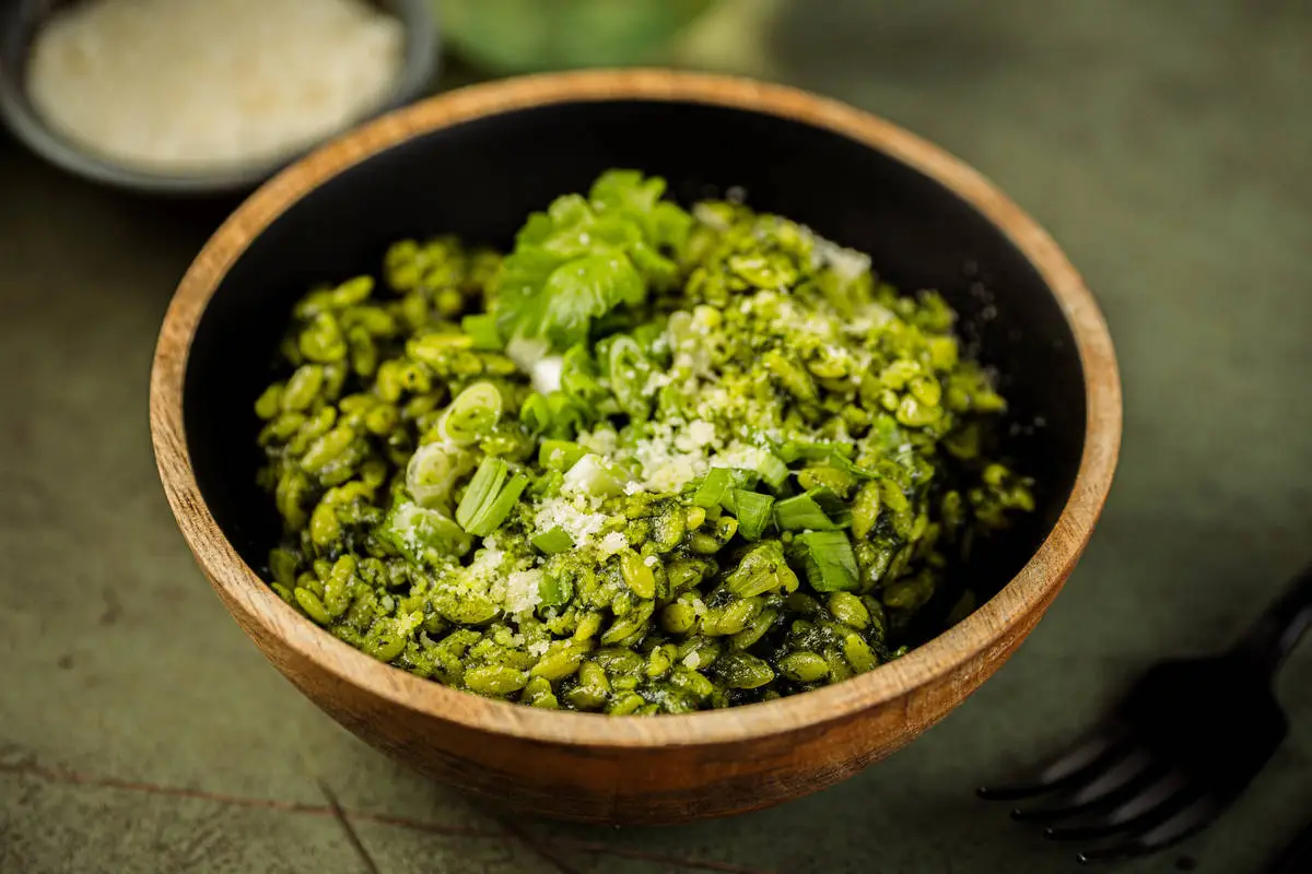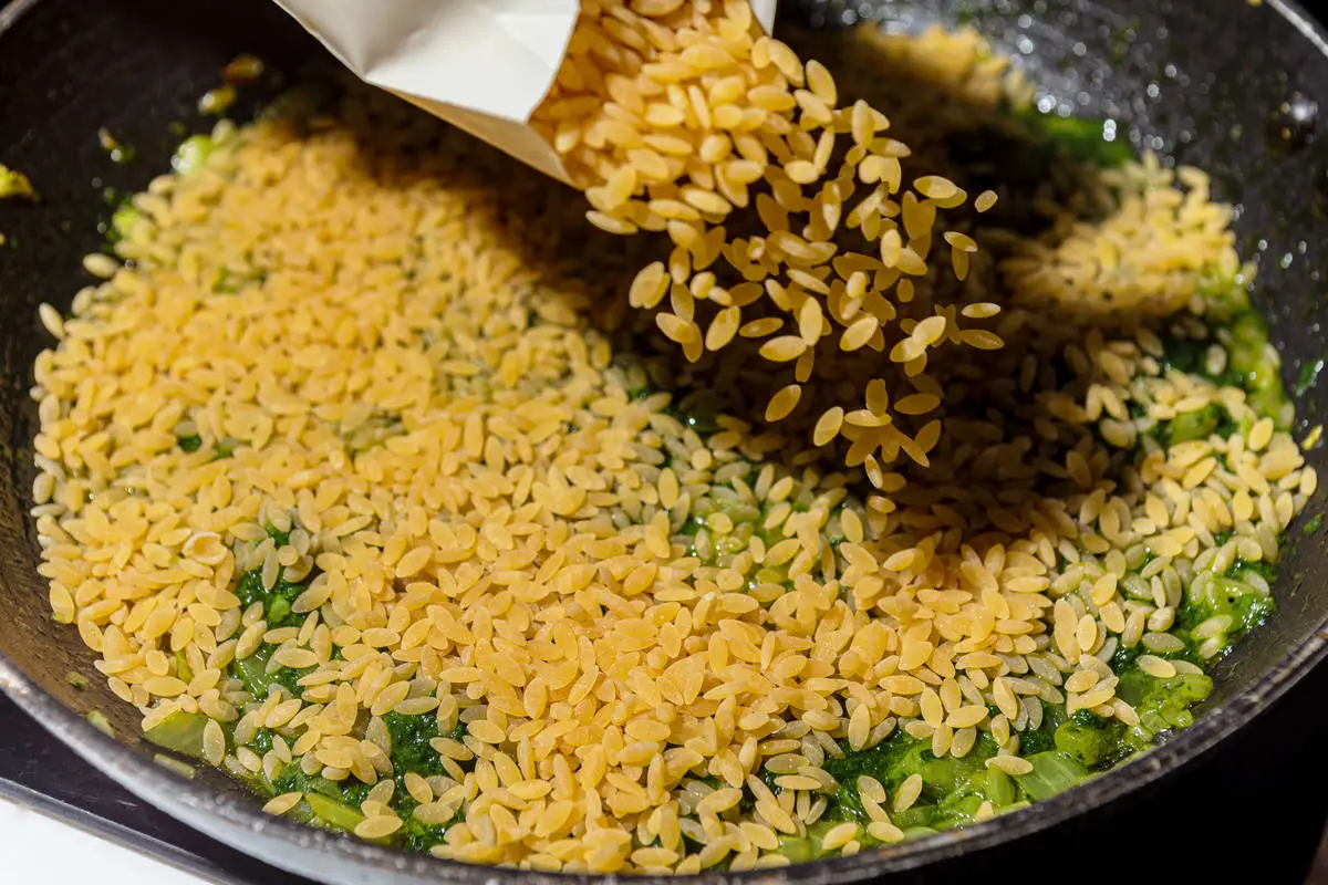 Паста орзо похожа на маленькие зёрнышки и выглядит довольно непривычно. Предлагаем приготовить её по аналогии с израильским птитимом — в ближневосточном стиле. У вас получится очень нежное, сливочное блюдо жизнерадостного зелёного цвета.