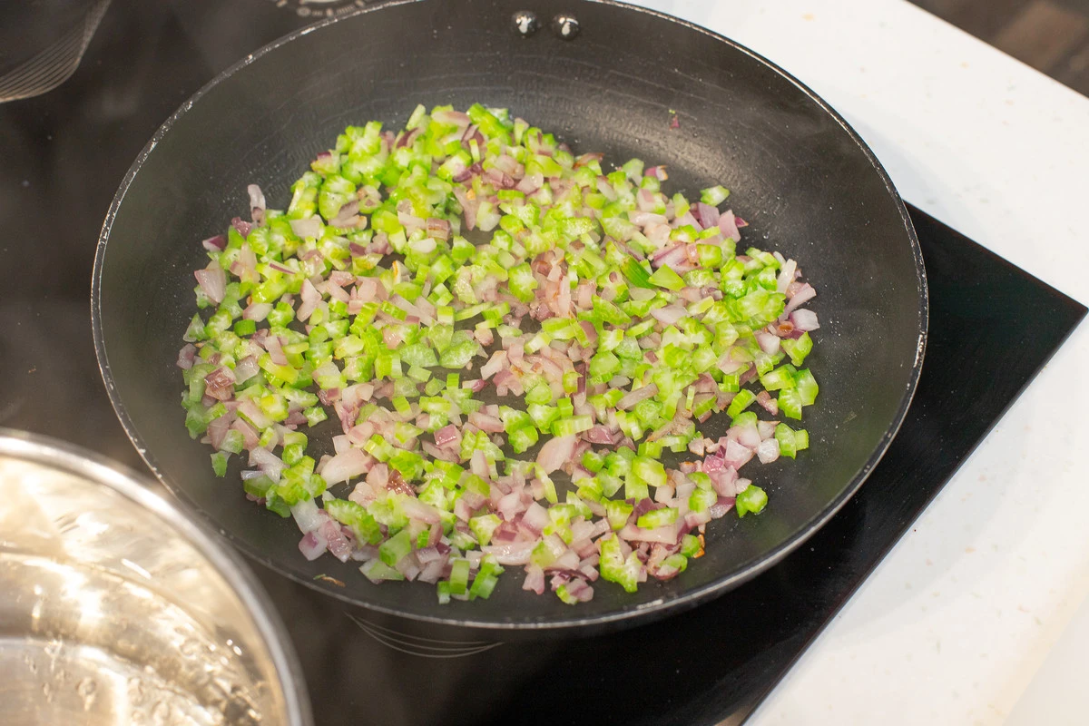 Лук и сельдерей нарежьте мелкими кубиками. Разогрейте сковороду с растительным маслом. Слегка обжарьте лук и сельдерей, периодически помешивая.