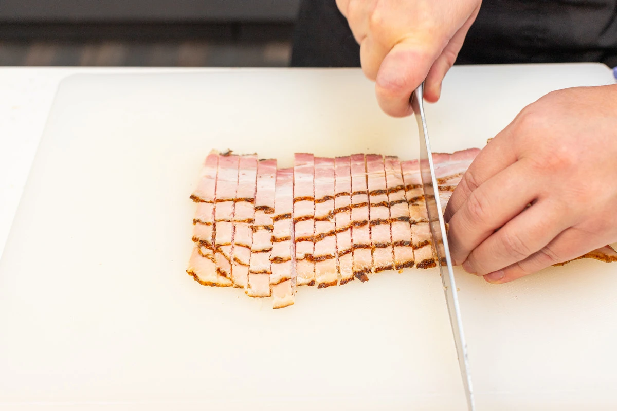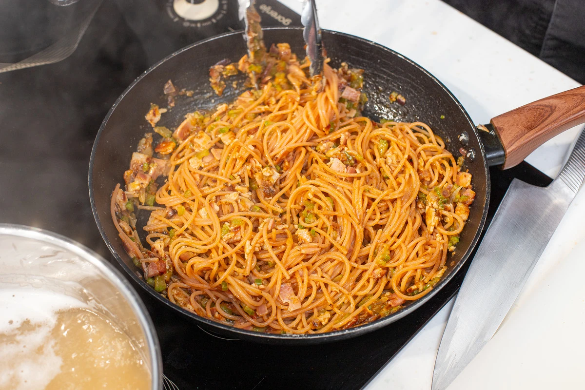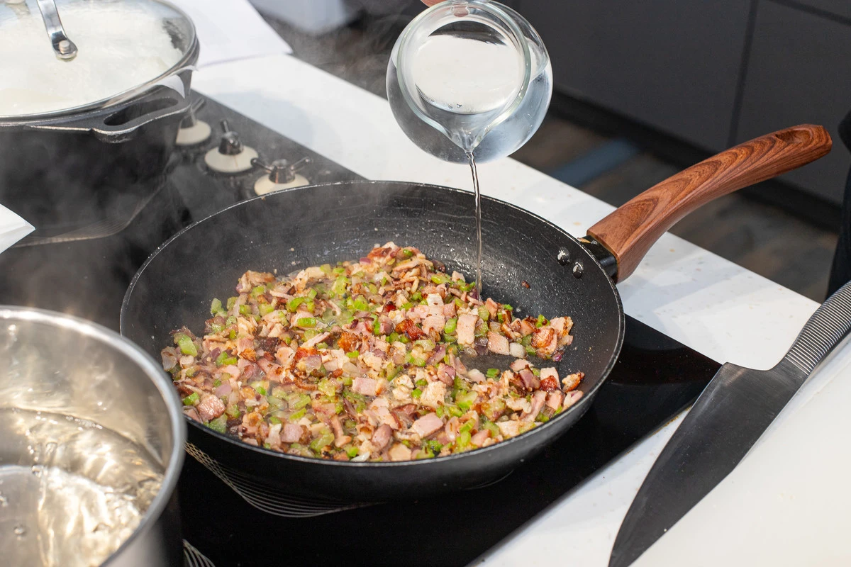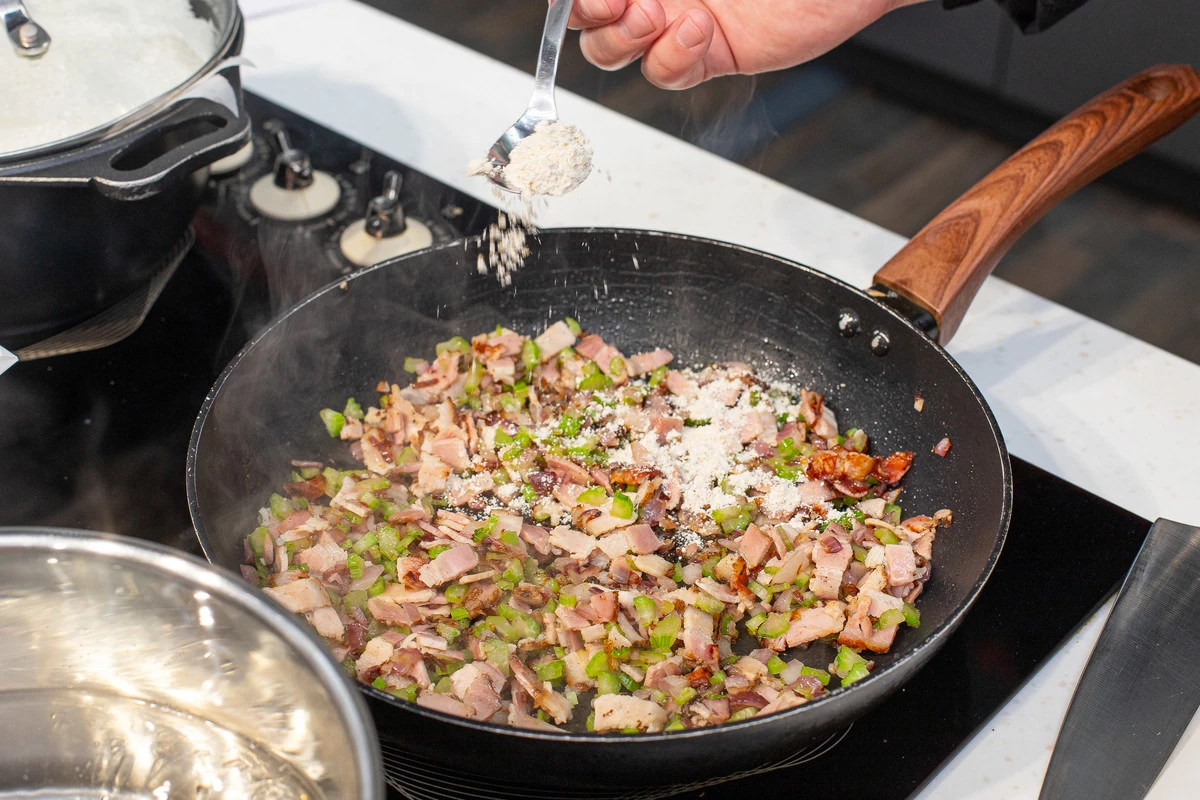 Грудинку нарежьте полосками, добавьте к овощам. Обжаривайте всё вместе примерно 5-7 минут, пока грудинка не приобретёт красивый золотистый цвет.