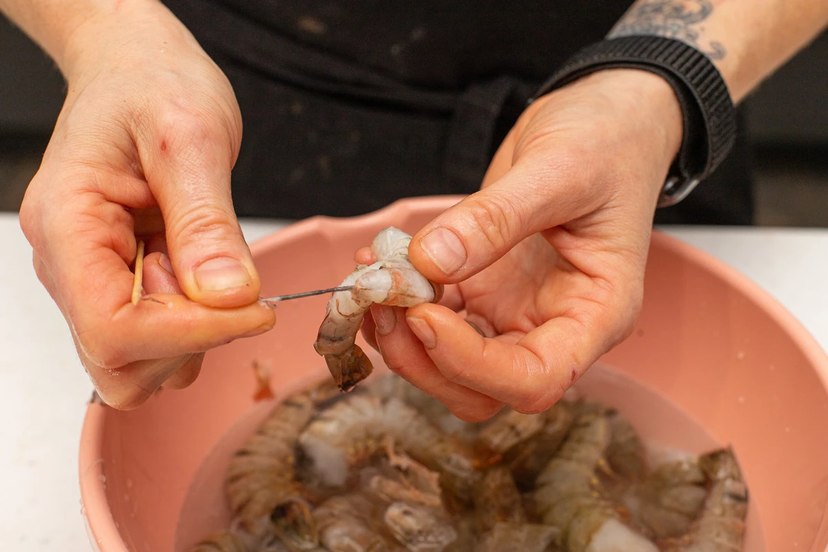 Креветки очистите от панцирей, хвостики можно оставить для красивой подачи. Переберите креветки, удаляя кишечную вену из спинки при помощи зубочистки, промойте и обсушите.