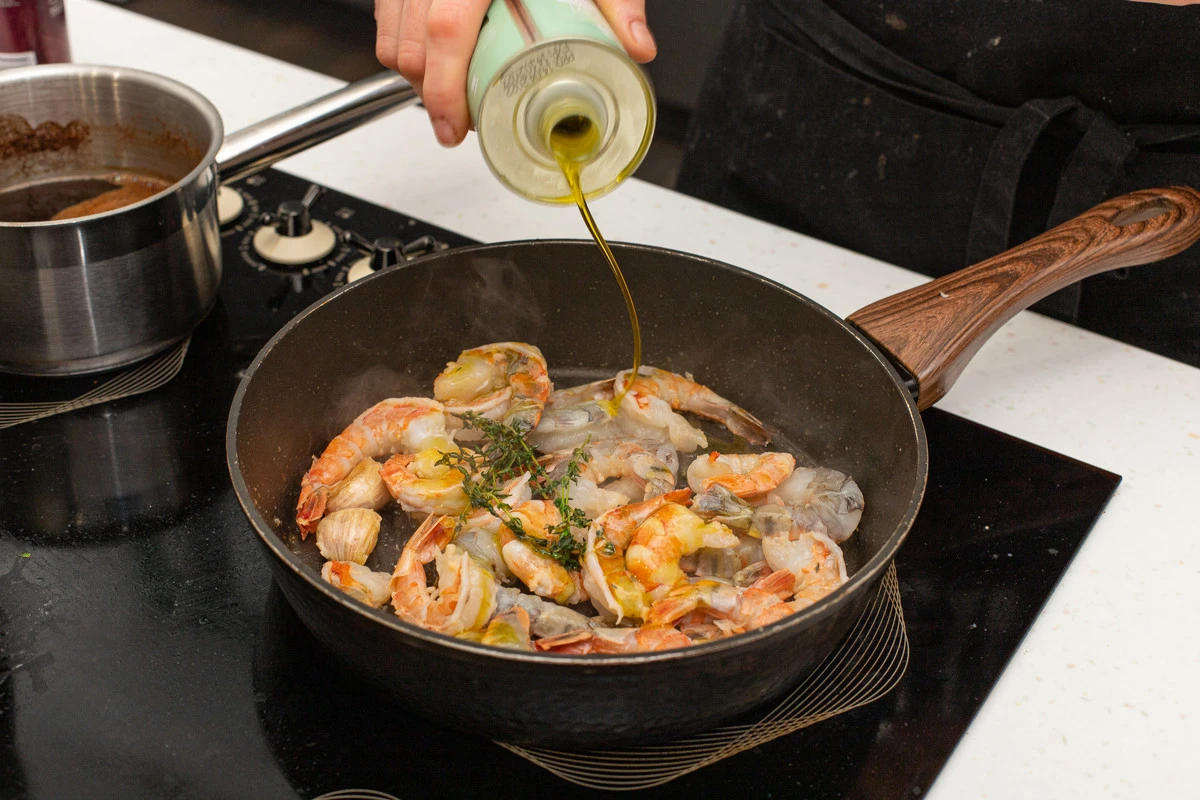 На сковороде растопите сливочное масло с добавлением оливкового, выложите веточки тимьяна и раздавленные зубчики чеснока. Быстро обжарьте креветки по 1,5 минуты с каждой стороны на сильном огне. Можно сделать это в два приёма, чтобы креветки пожарились, а не начали тушиться.