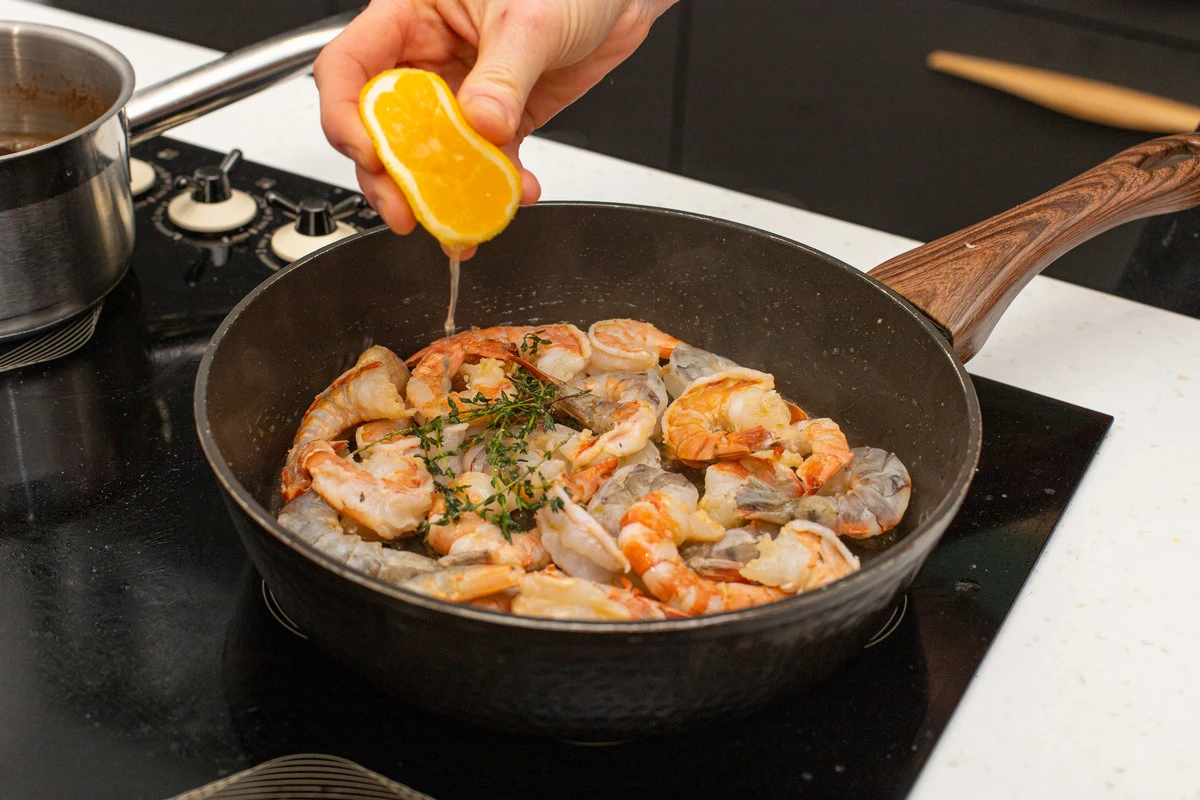 В конце выдавите сок половинки лимона в сковороду, посолите, поперчите и снимите креветки с огня. Добавьте в сковороду рубленую петрушку.