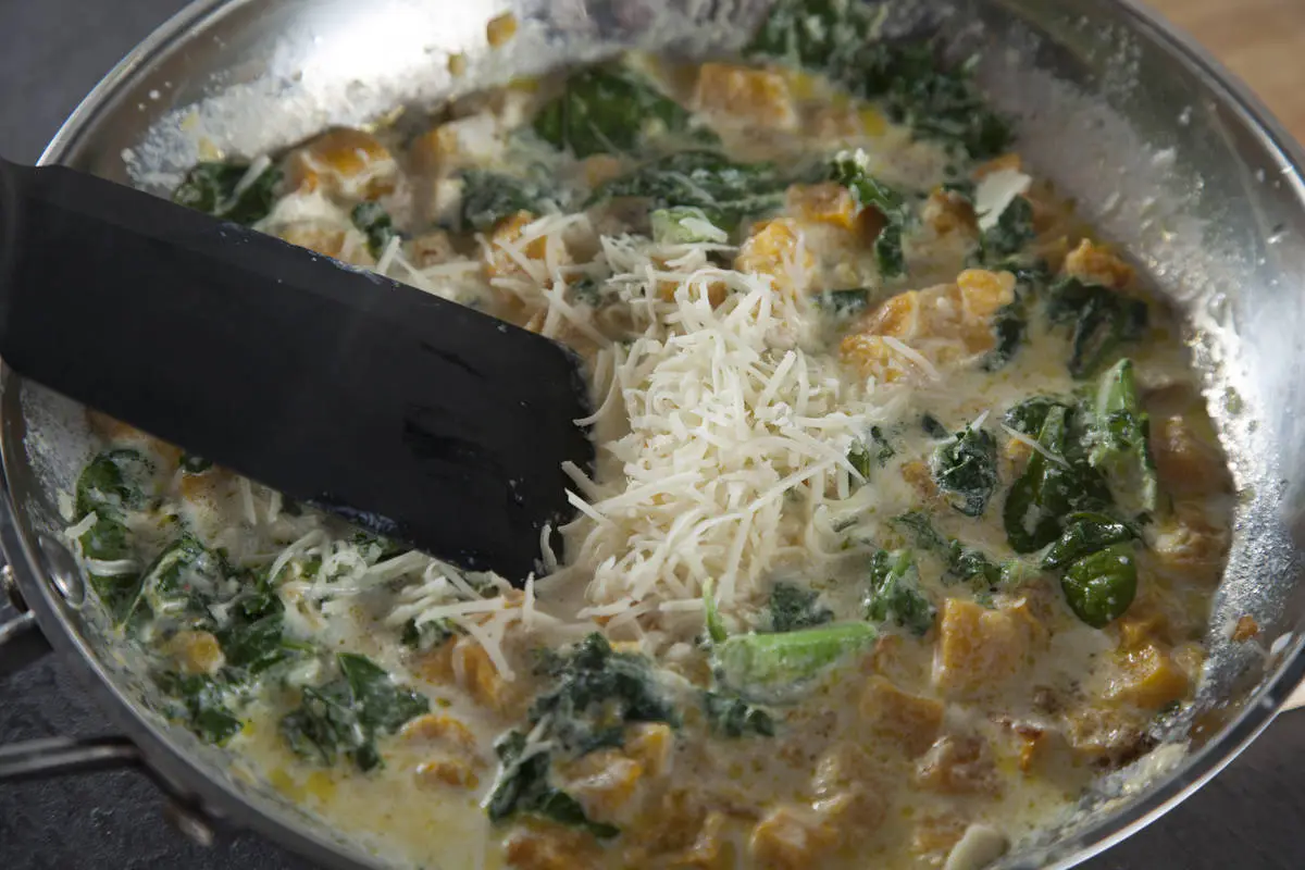 Добавьте тыкву и свежий шпинат к сливкам вместе с частью сыра, погрейте еще минуту и перемешайте.