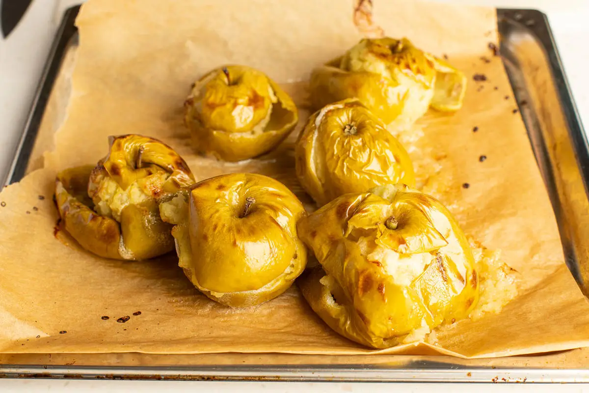 Противень застелите пергаментом и запеките яблоки целиком при 190 °C до мягкости (это займёт около 30 минут).