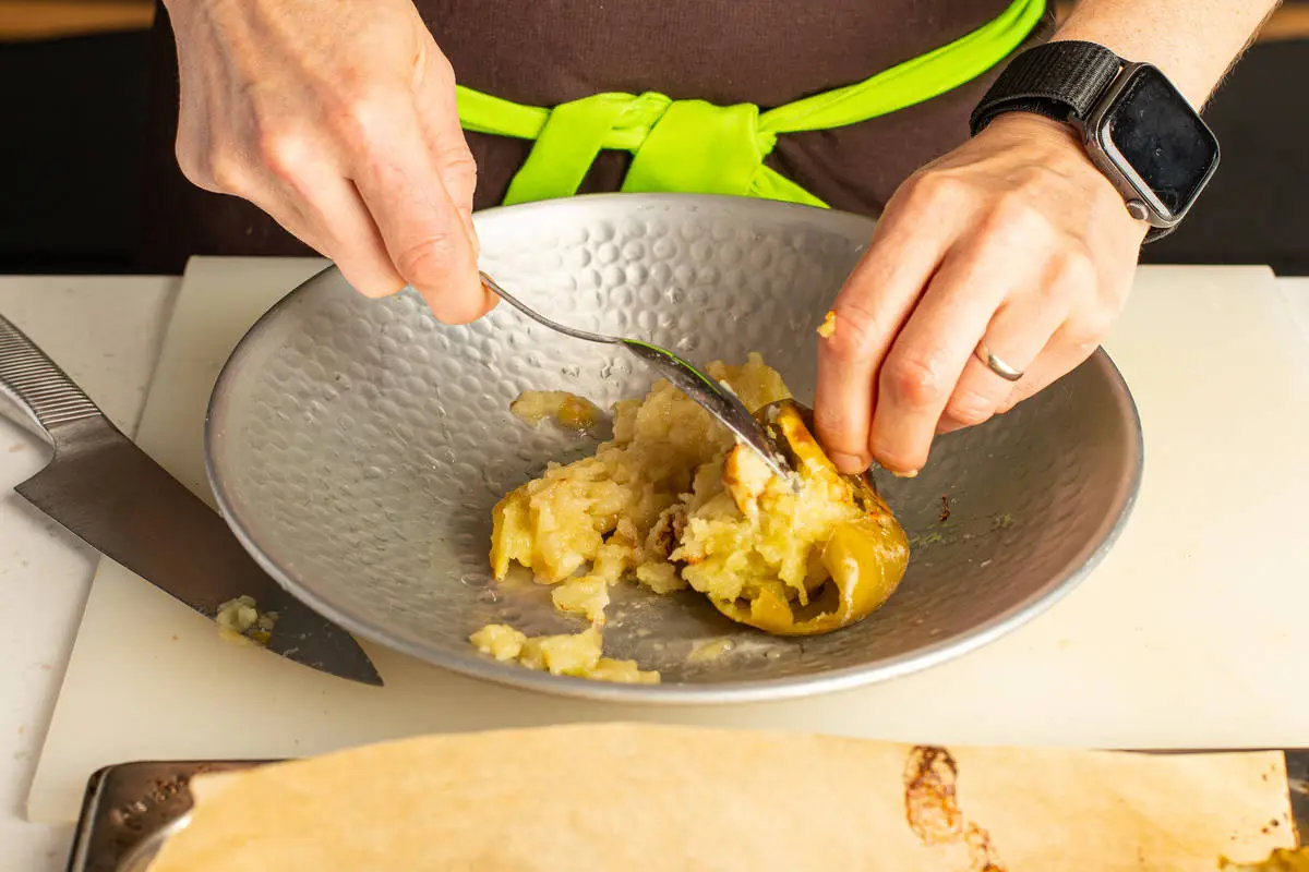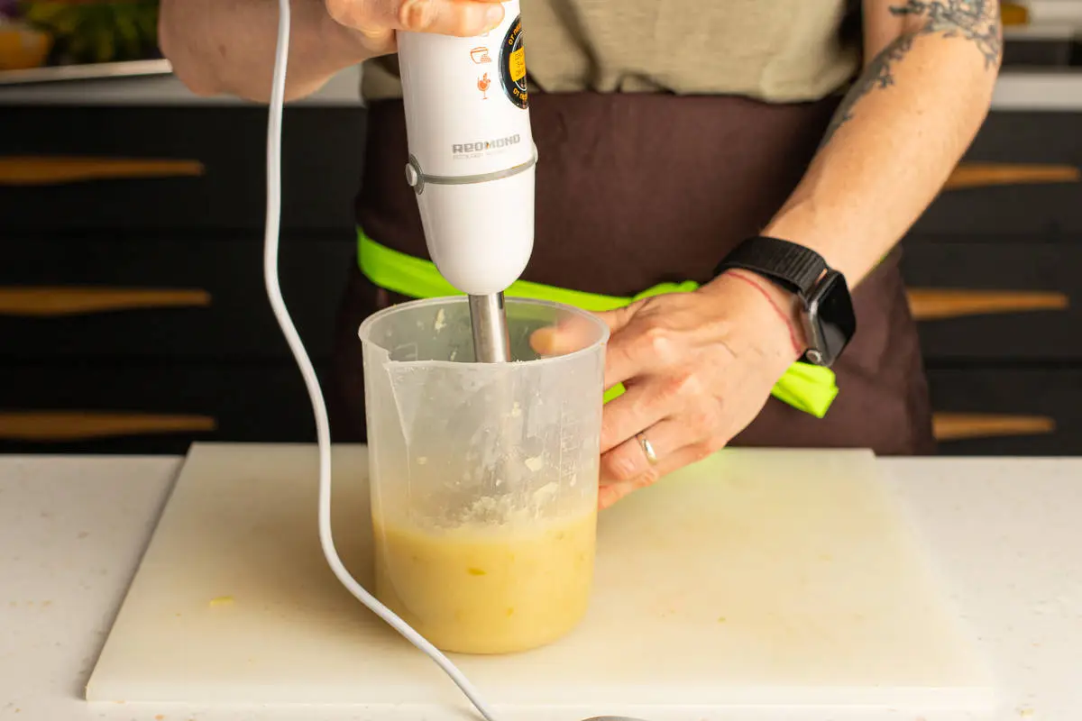Мякоть пробейте в блендере. У вас должно получиться примерно 500 г пюре. Переложите его в миску и остудите.
