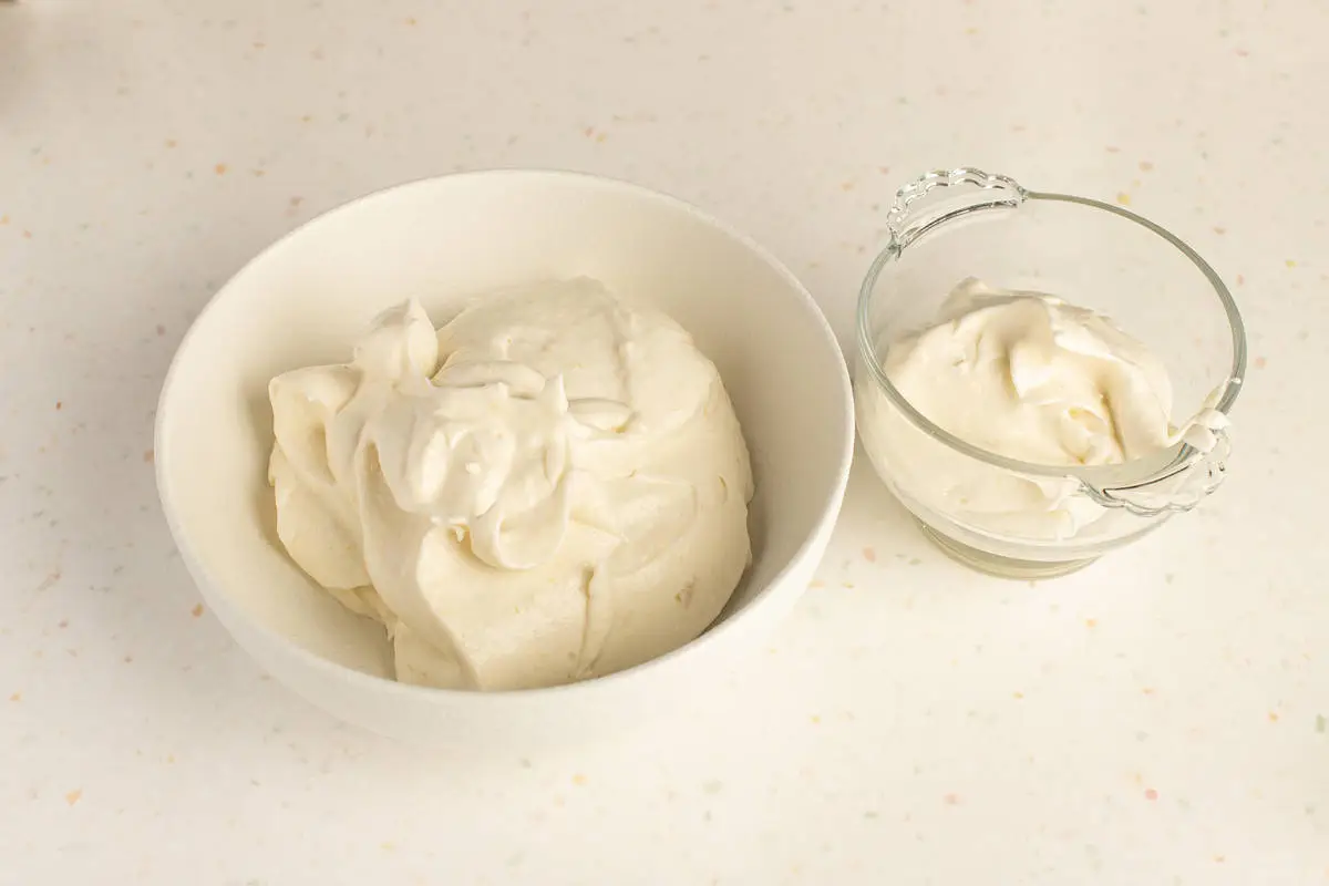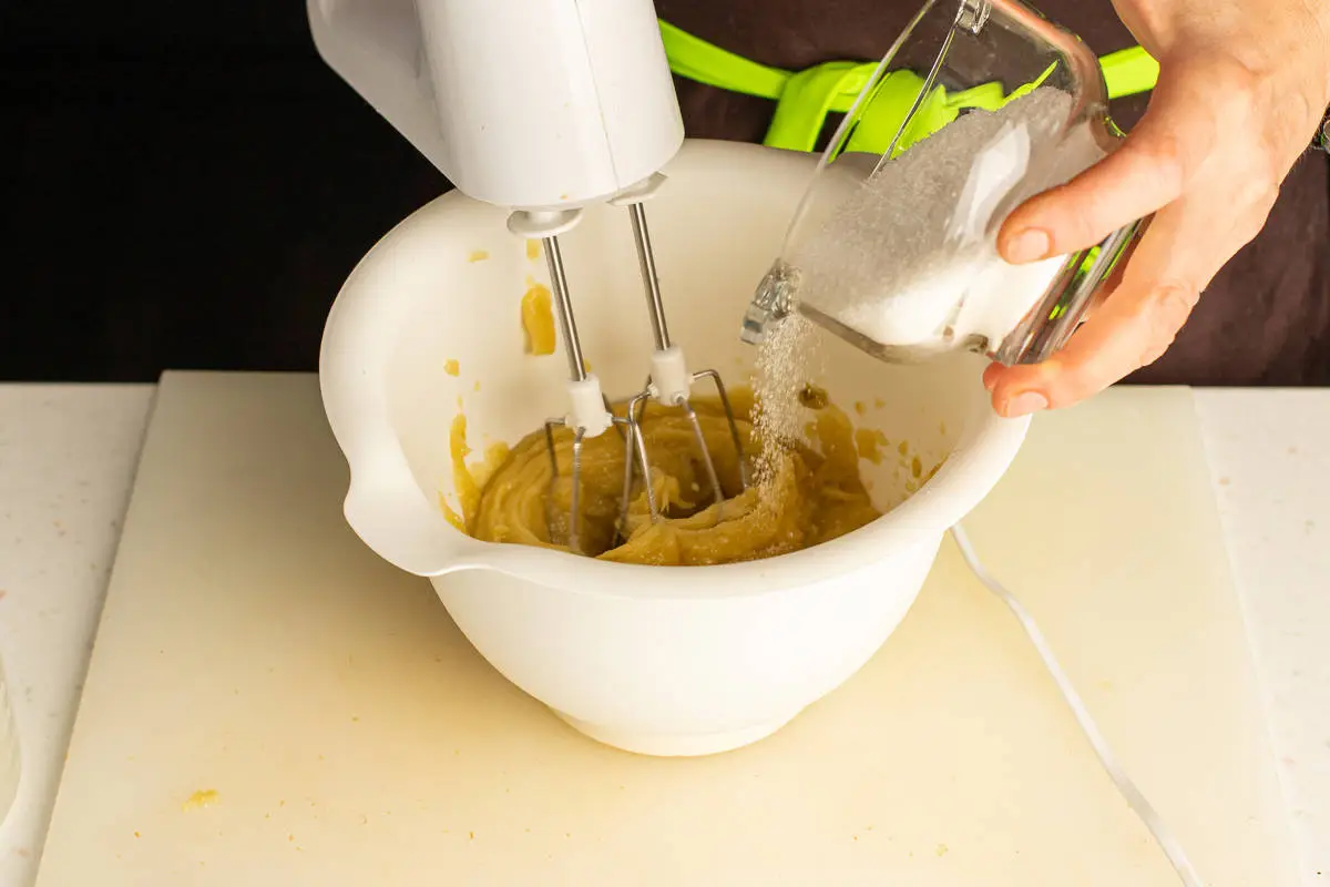Добавьте к пюре сахар и белок, взбивайте миксером до пышной светлой массы примерно 7-10 минут.