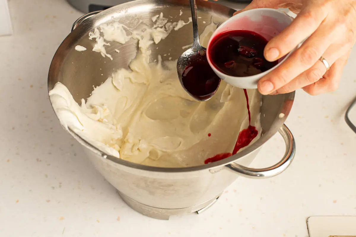 Остальное разделите пополам, в одну часть добавьте ягодный сок и перемешайте.