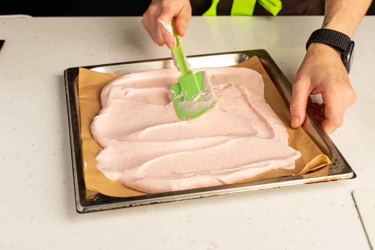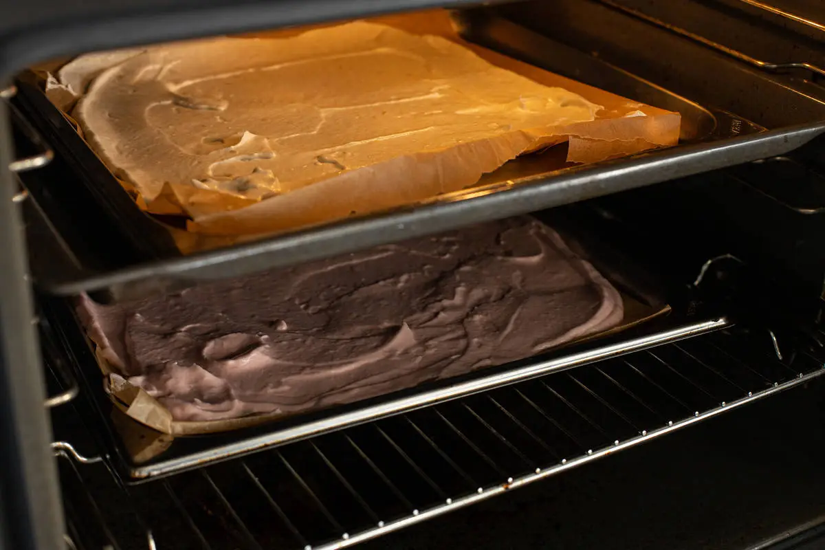 Два противня застелите пергаментом, выложите яблочно-белковую массу и разровняйте, чтобы получился слой примерно 1,5 см толщиной.