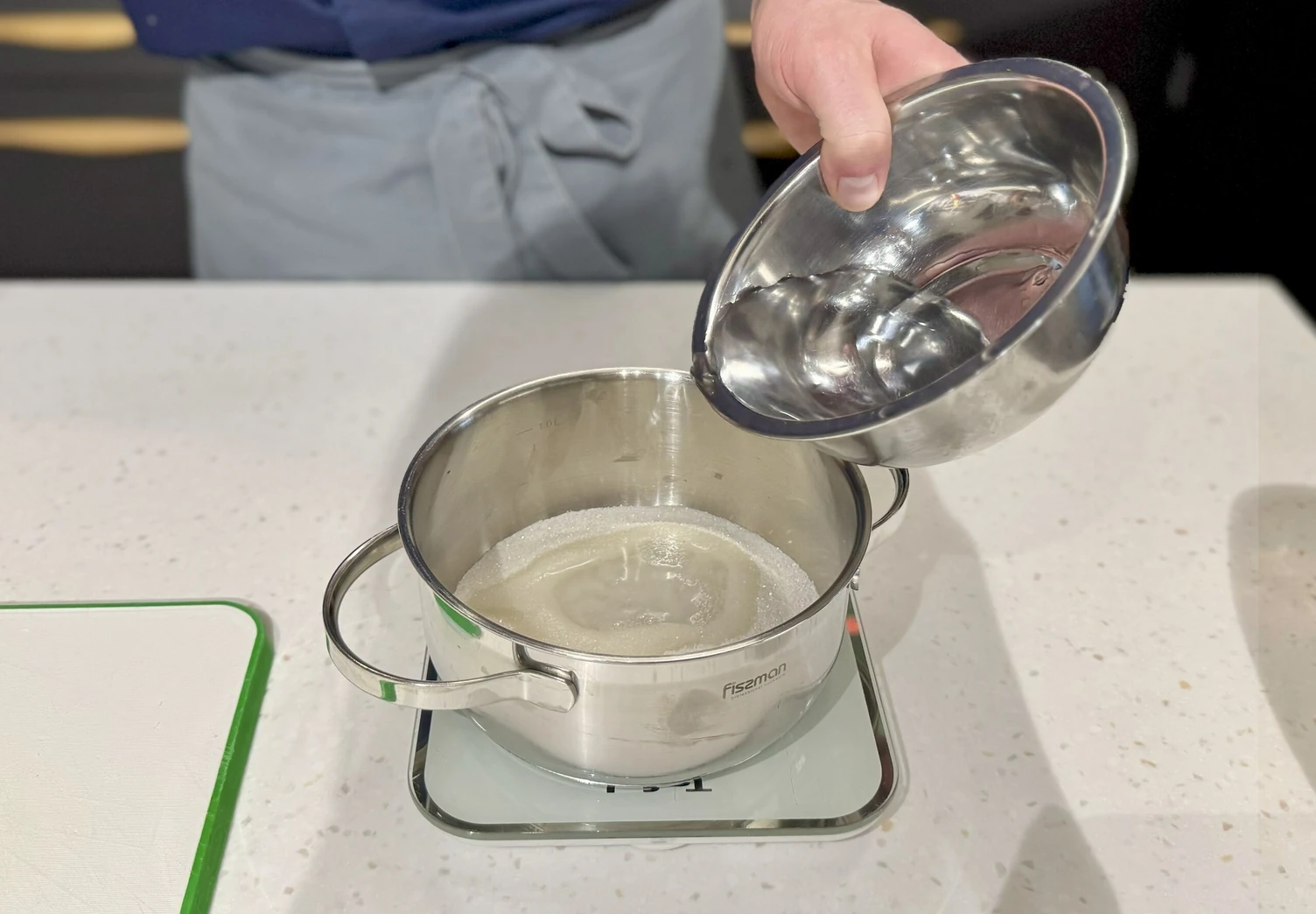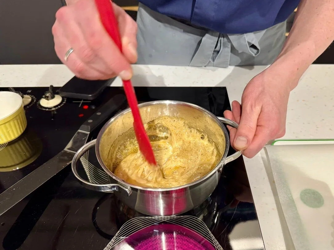 В сотейнике смешайте сахар с водой и нагревайте на среднем огне, постоянно помешивая, пока сахар полностью не растворится. Доведите смесь до золотисто-янтарного оттенка — важно не передержать, иначе появится горький привкус.