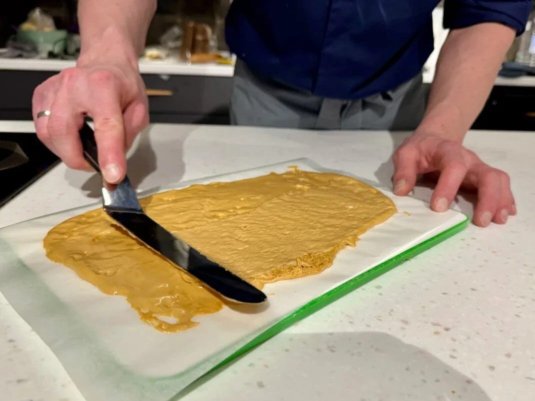 Заранее застелите стол силиконовым ковриком или силиконизированным пергаментом. Вылейте горячую массу и сразу же разровняйте её шпателем или широким ножлом(можно слегка смазать его маслом, чтобы карамель не прилипала).
