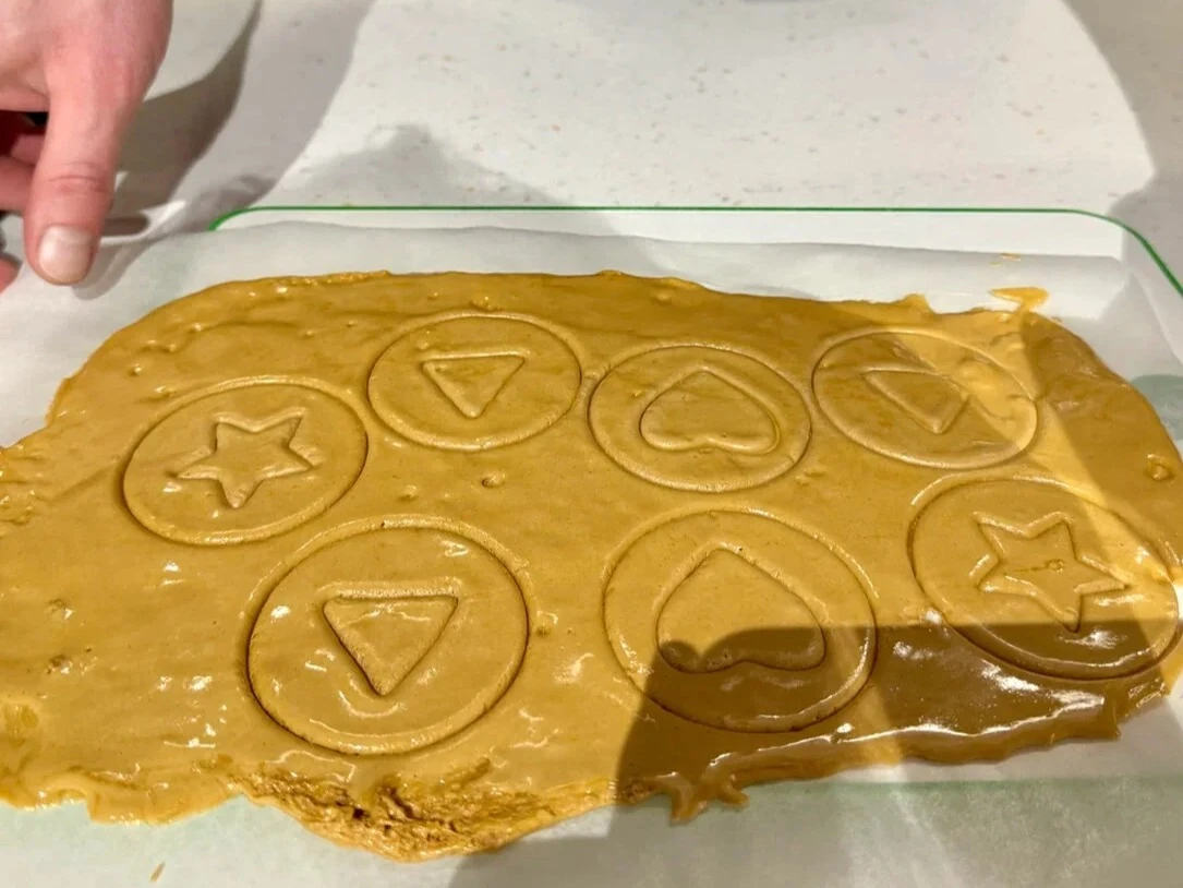 Пока карамель ещё пластичная, быстро вырежьте кружки (например, стаканом), а внутри них — звёздочки, треугольники или другие фигуры. Действовать нужно очень быстро — остывшая карамель становится хрупкой! Аккуратно отделите готовые печенья от пергамента и остатков массы.
