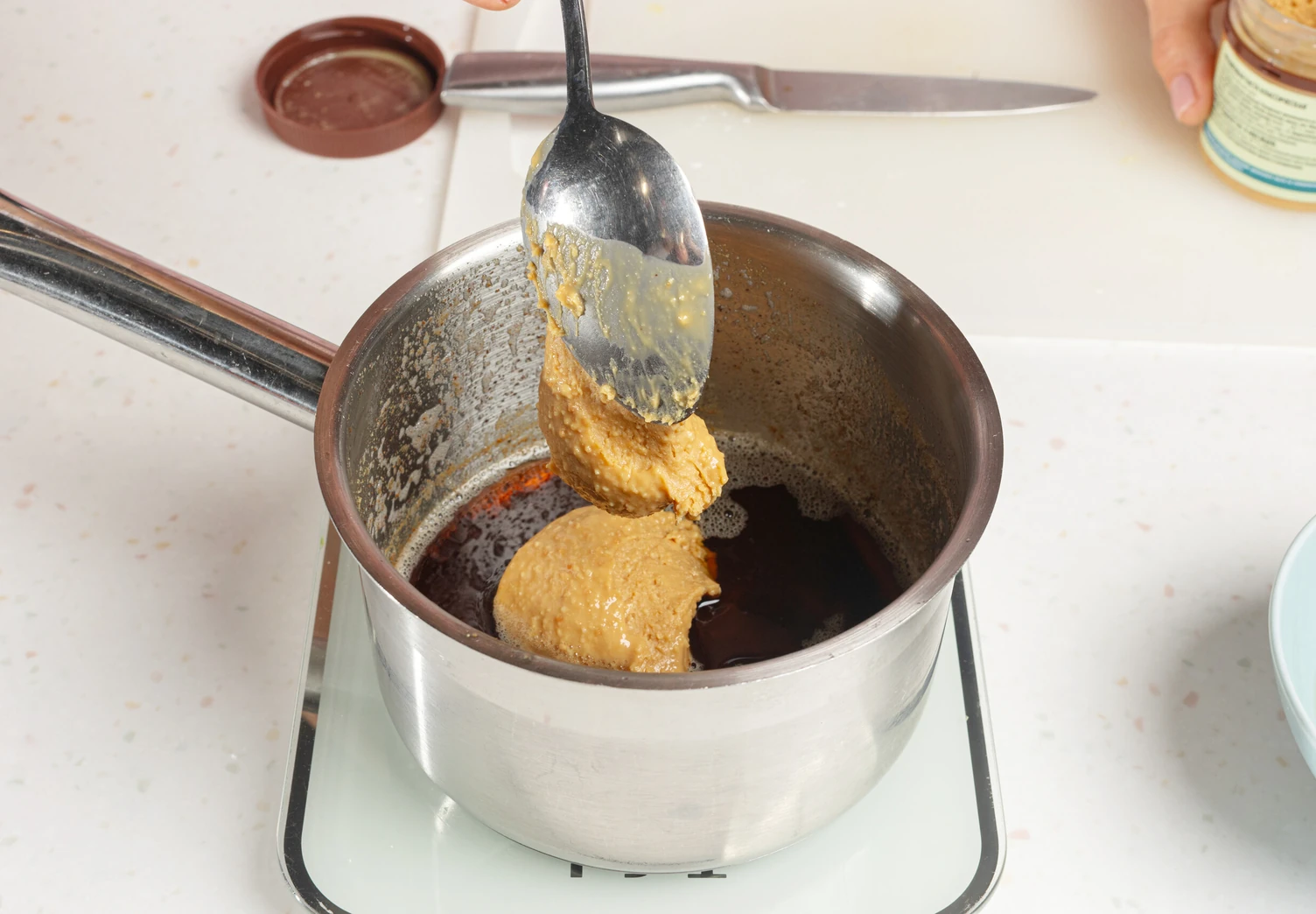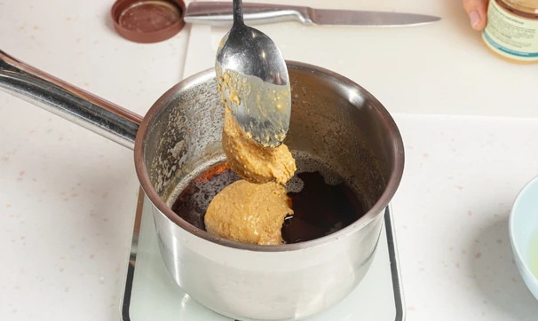 В горячее сливочное масло введите арахисовую пасту, размешайте венчиком до однородности.