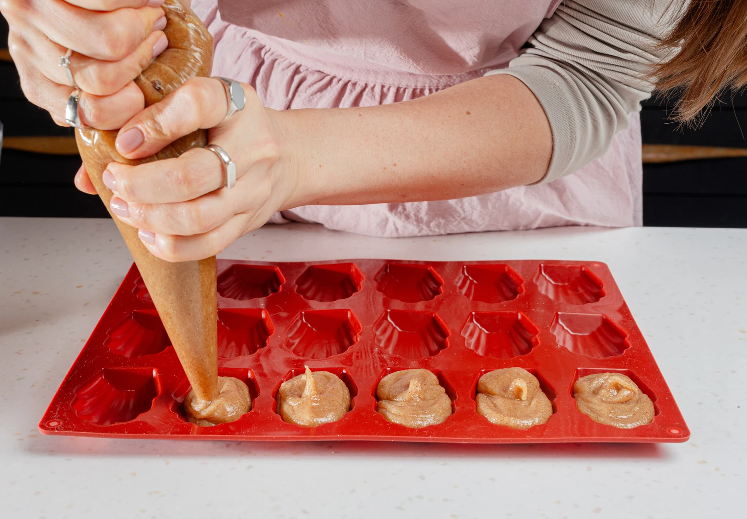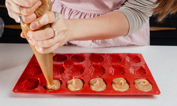 Обрежьте кондитерский мешок, чтобы получилось отверстие примерно 1,5–2 см. Отсадите из него тесто в форму для мадленок так, чтобы оно доходило до краёв.