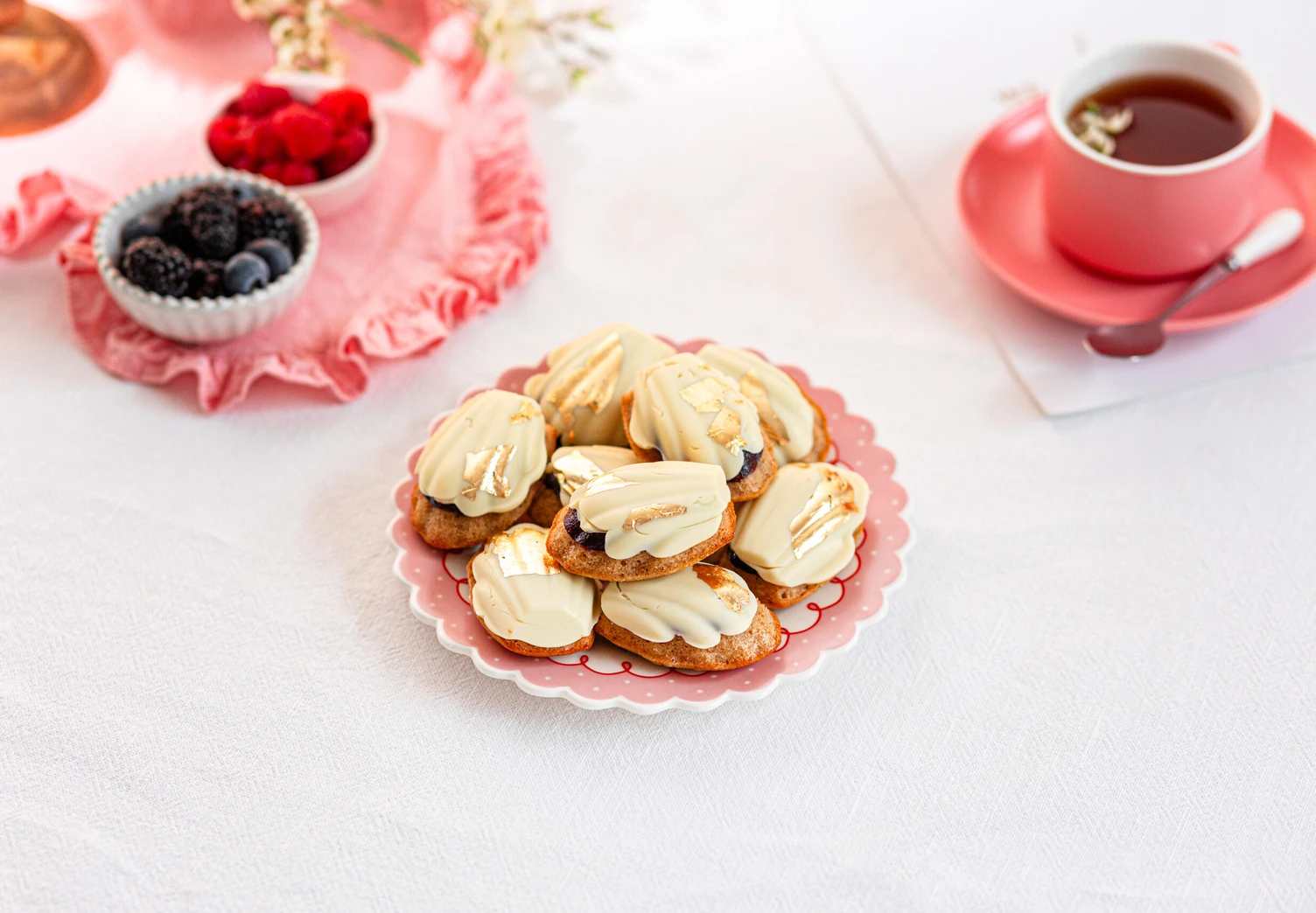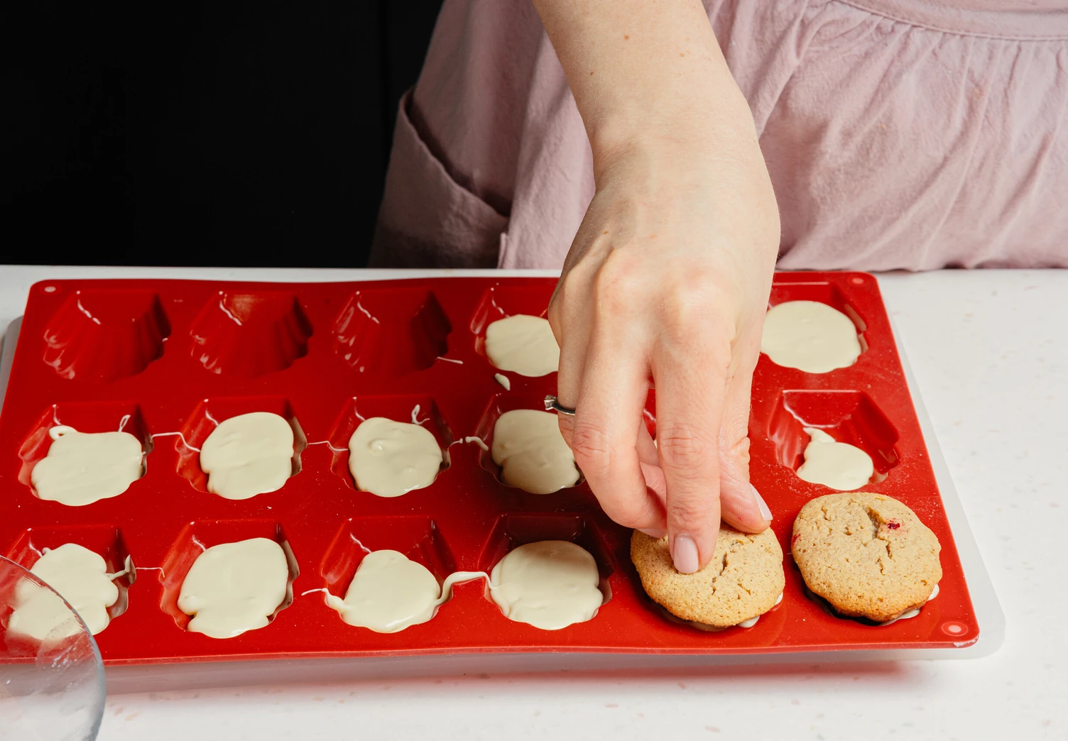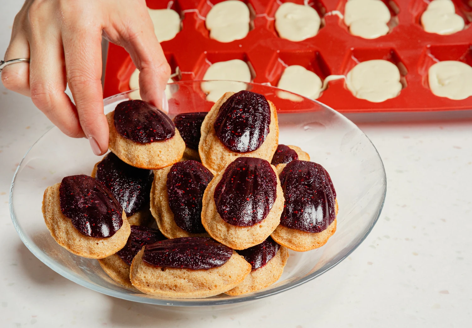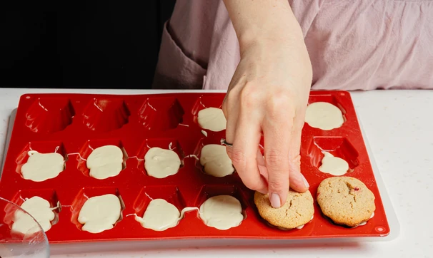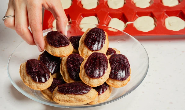 Сверху положите остывшие мадленки ягодной начинкой вниз, придавите и уберите в морозилку на 15 минут.