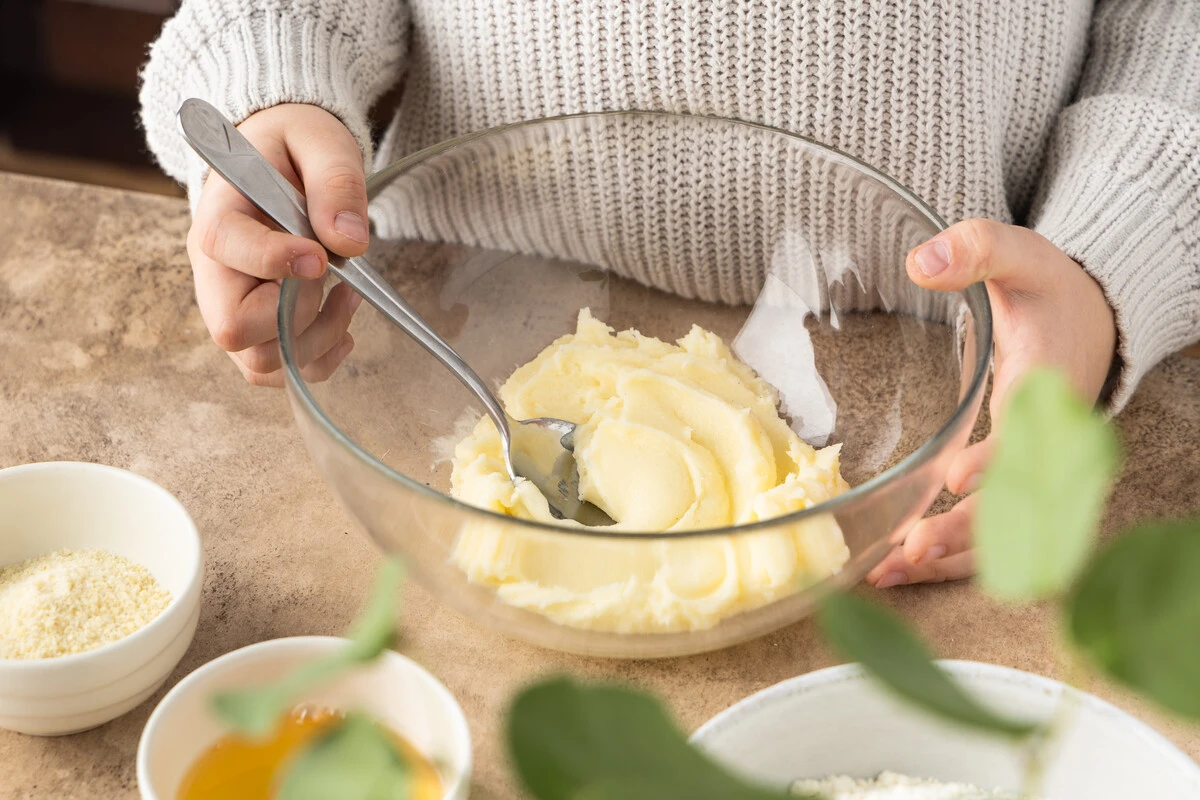Достаньте масло из холодильника примерно за 20 минут до начала приготовления, чтобы оно размягчилось. Положите размягчённое масло в миску, добавьте сахарную пудру и ванильный экстракт (по желанию можете взять вместо него 1–2 ч. л. ванильного сахара с натуральной ванилью). Перемешайте всё до однородности, это легко сделать ложкой.