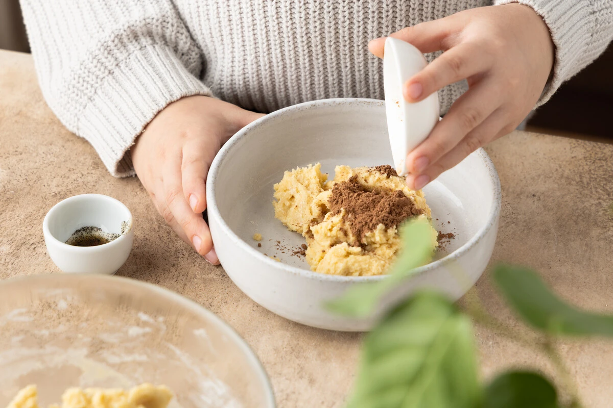 Отделите примерно ¼ теста и добавьте в него какао, перемешайте до однородности. Заверните тесто обоих видов в пищевую плёнку и уберите в холодильник примерно на 30 минут.