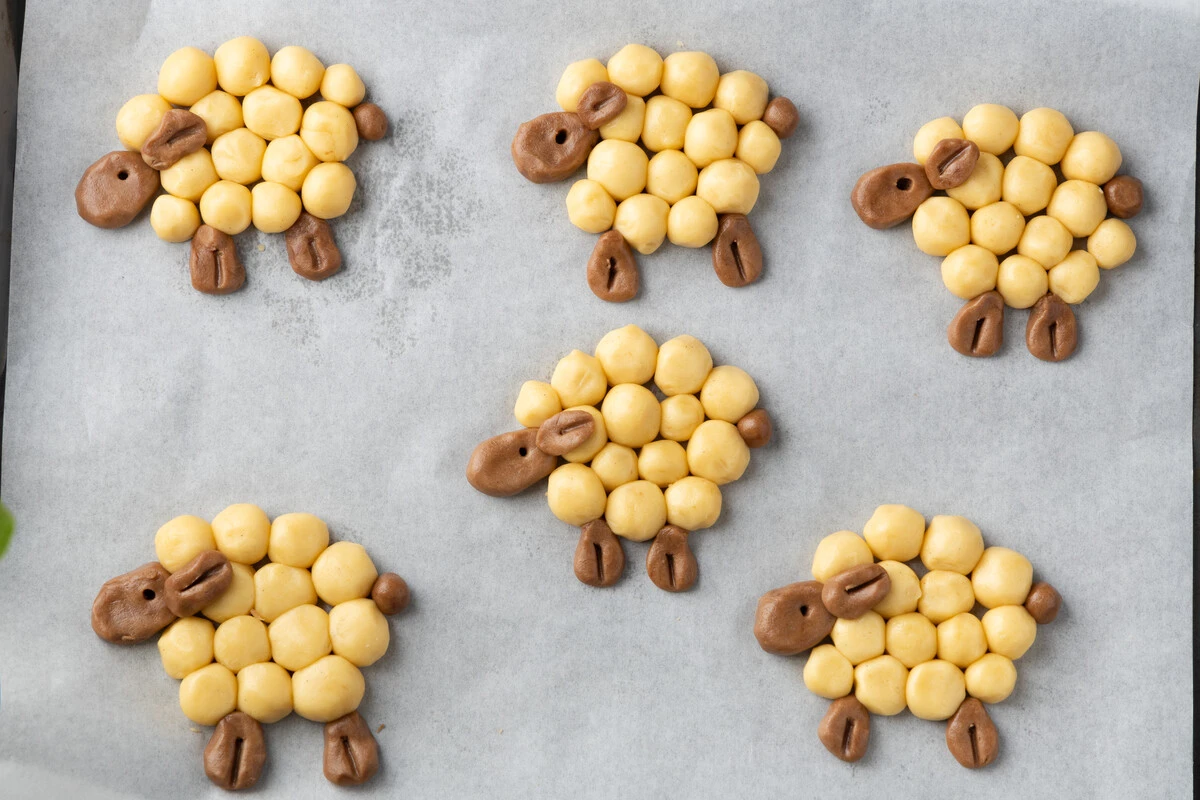 Застелите противень пергаментом для выпечки. Сделайте из светлого теста шарики диаметром около 1–1,5 см. Сформируйте тело овечки, выложив примерно 15 шариков на противень в форме круга так, чтобы они соприкасались, но слеплять их и прижимать друг к другу или противню не нужно. Если между какими-то шариками есть небольшие промежутки, не страшно. Слепите из шоколадного теста голову, ушко, 2 лапки и хвостик овечки, прикрепите к телу. С помощью зубочистки нарисуйте глаз и сделайте насечки на ушке и лапках. Овечка готова. Повторите то же самое для остального теста.