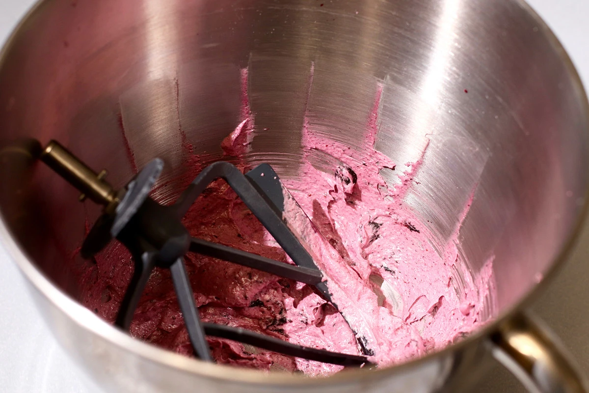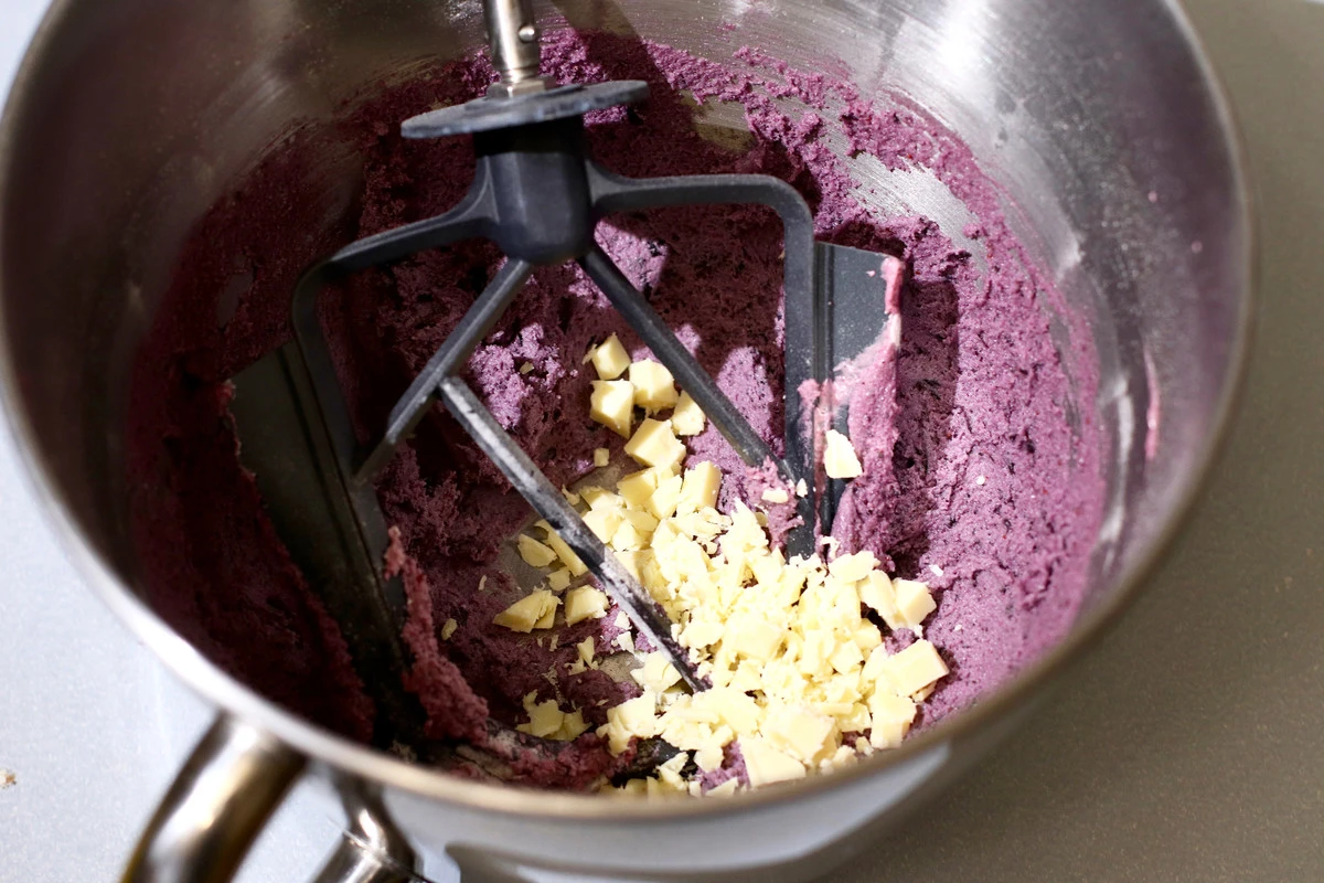 Замороженную чернику подогрейте в микроволновой печи или на плите до кипения. Остудите и добавьте к маслу, перемешайте до однородности.