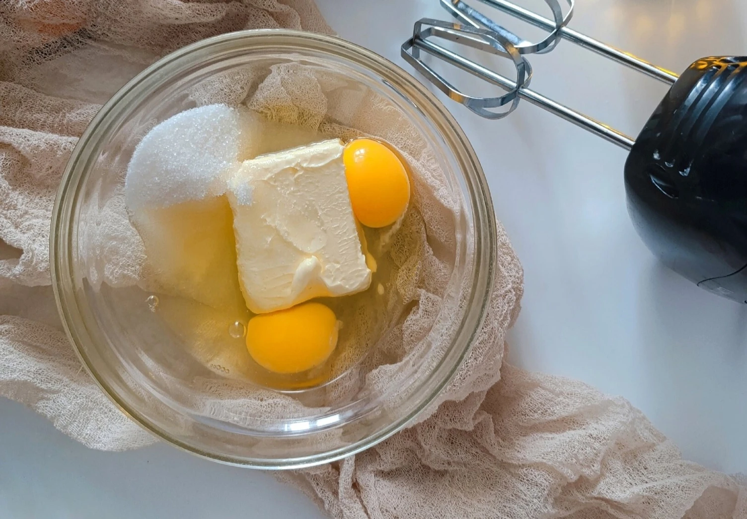 Взбейте мягкое сливочное масло с сахаром и яйцами.