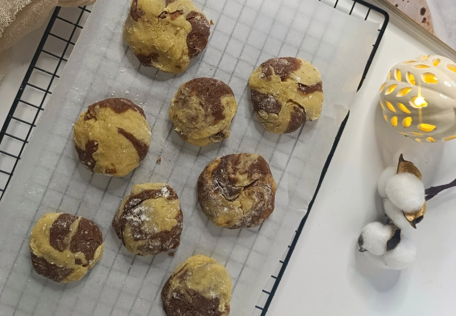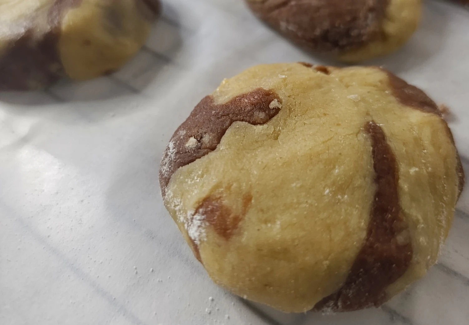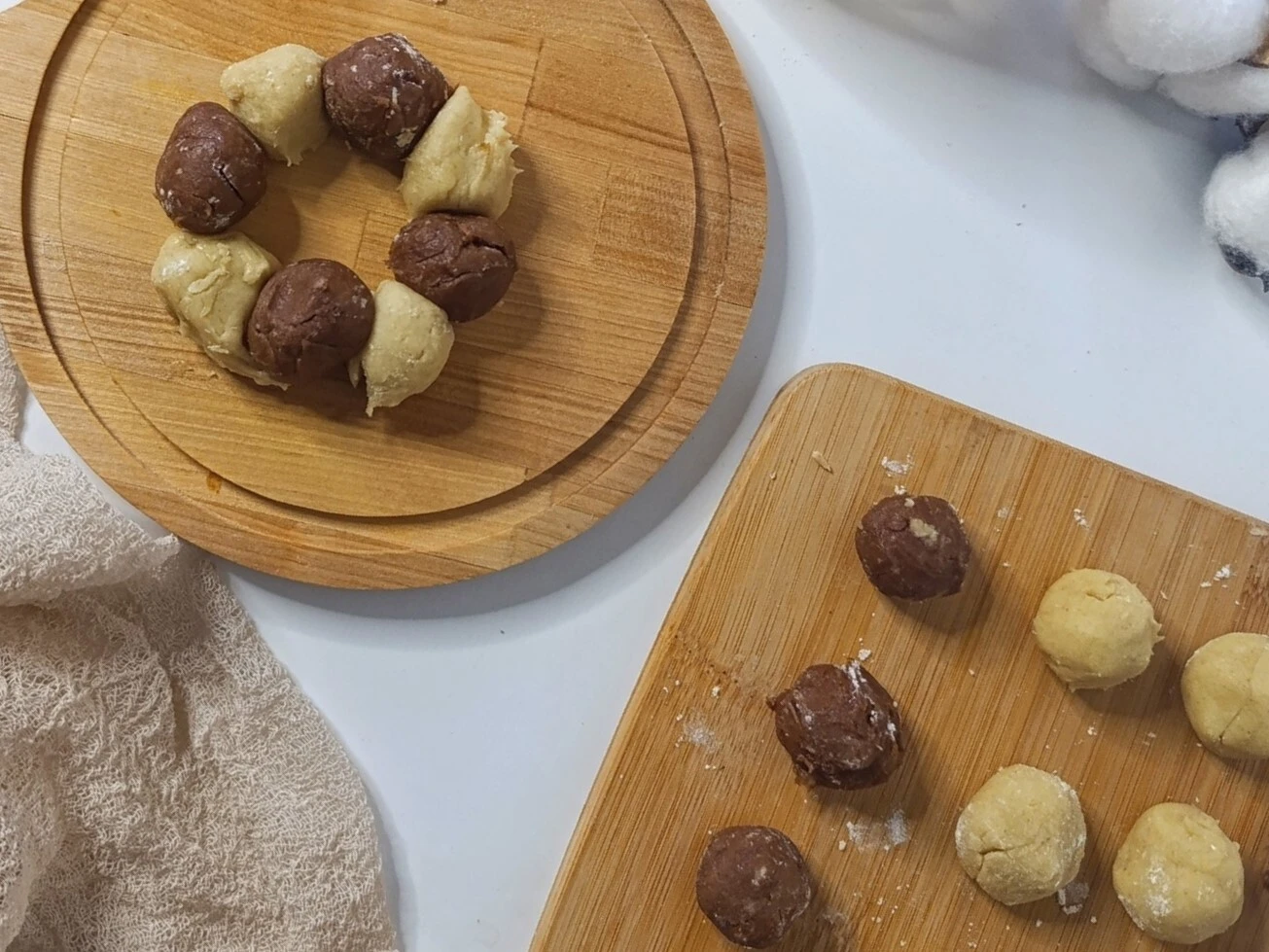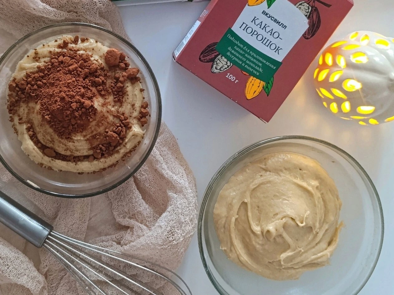 Разделите его на две части. В одну часть добавьте какао и тщательно перемешайте.
